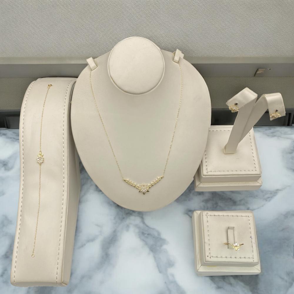 يمكن بسهولة تنسيق هذا الطقم مع إكسسوارات أخرى، سواء كانت من الذهب أو الأحجار الكريمة، ليمنحك إطلالة متكاملة ومتميزة.