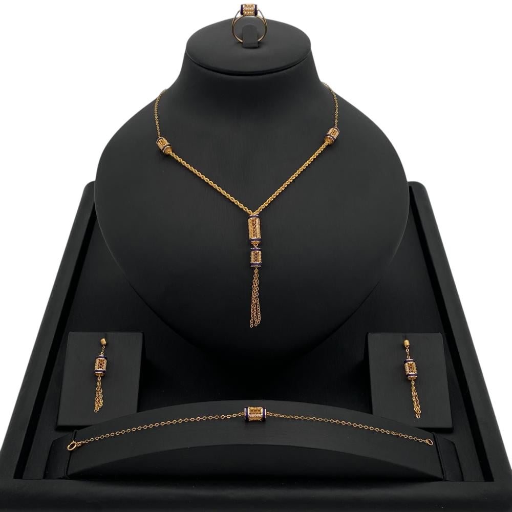 اختاري طقم ذهب عيار 21 لمناسباتك الخاصة، يتميز هذا الطقم بتصميم راقي وأنيق يبرز جمالك ويضيف لمسة من السحر والأناقة إلى إطلالتك. يتكون الطقم من قطع فاخرة مصنوعة بدقة واهتمام بالتفاصيل، حيث يتميز بجودة عالية ولمعان رائع يجعله مثالياً للارتداء في المناسبات الخاصة. احصلي على هذا الطقم الفريد وارتديه لتتألقي بأناقة لا مثيل لها وتبهري الجميع بجمالك وأناقتك.