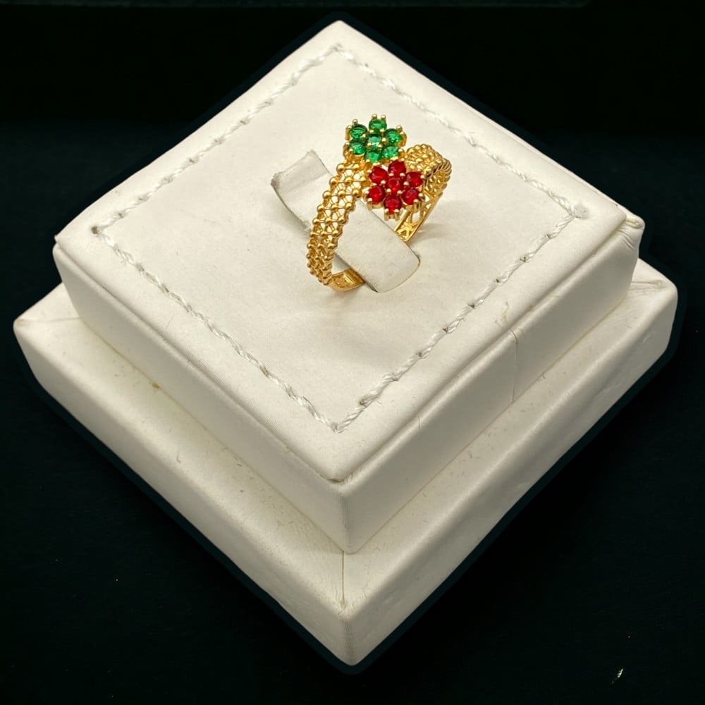 خاتم ذهب عيار 21 يتسم هذا الخاتم بالفصوص الحمراء والخضراء التي تعطي بريقًا مذهلاً على شكل الوردة، مما يض لمسة من الجمال الطبيعي على الخاتم، ويمكن ارتدائه في الحياة اليومية او في العمل لمحبين الإطلالة الهادئة البسيطة