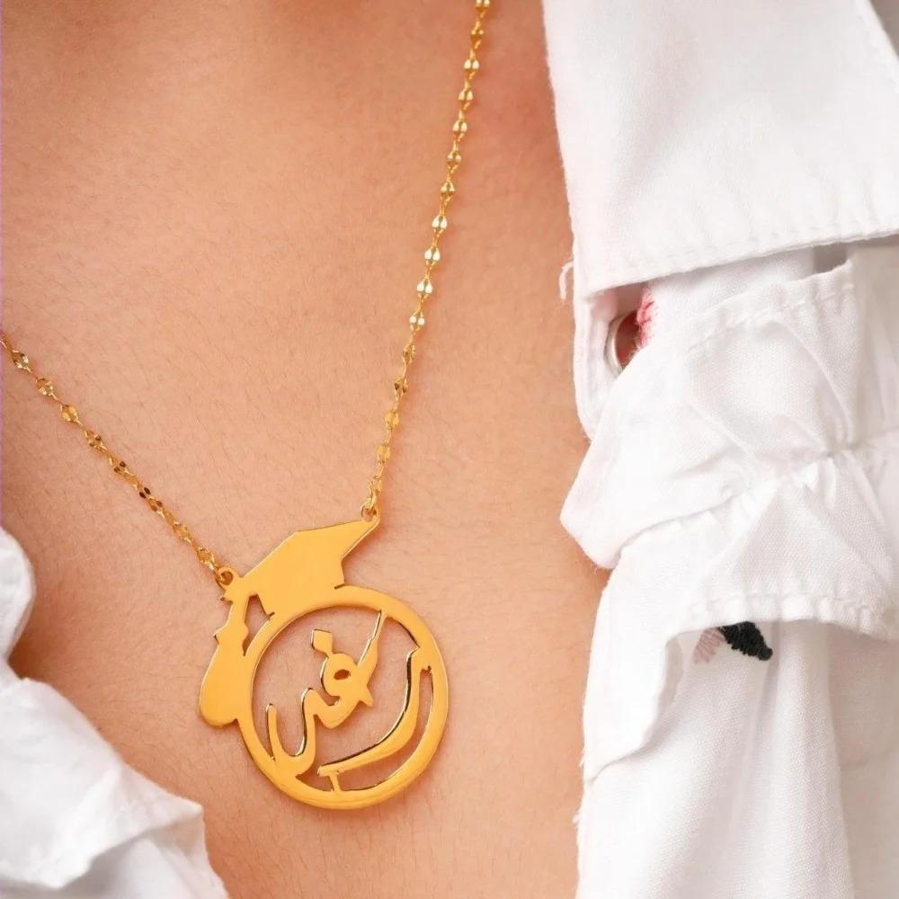 تفاصيل تصميم قلادة ذهب باسمك مع عقد قبعة التخرج أنيق