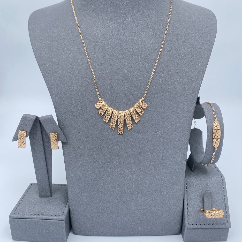 - الجودة العالية والمتانة: يعتبر الذهب عيار 21 من أفضل أنواع الذهب، فهو يجمع بين الجمال والمتانة. بفضل النسبة العالية من الذهب الخالص (87.5%)، يتمتع الطقم بمتانة ممتازة، مما يضمن بقاءه في حالة ممتازة لفترة طويلة. سواء كنتِ ترتدين الطقم بشكل يومي أو في مناسبات خاصة، فإنكِ ستستمتعين بجماله الذي يدوم.