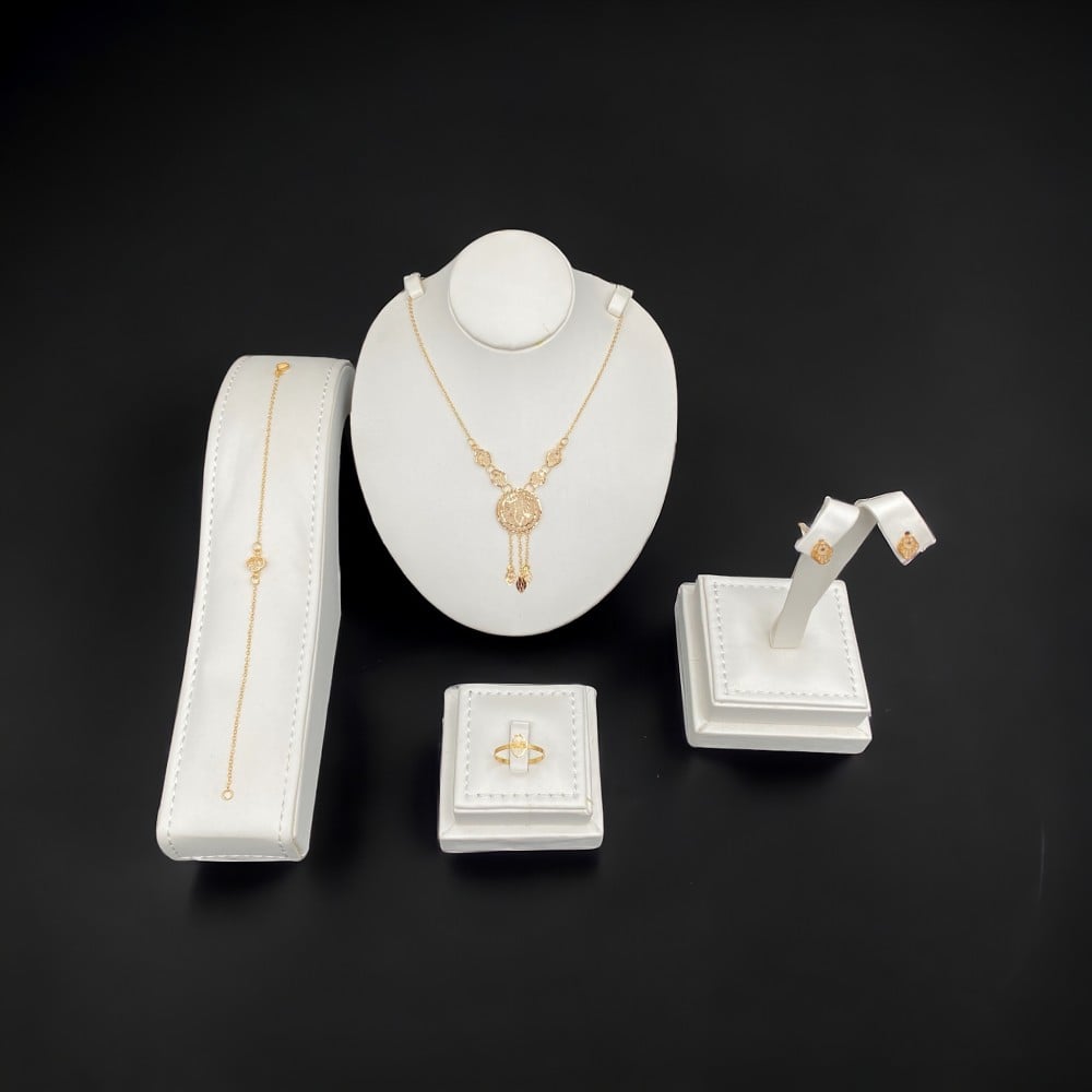 يتسم هذا الطقم بتصميمه الفريد الذي يجمع بين العصرية والكلاسيكية، مما يجعله قطعة مناسبة لكل المناسبات. تفاصيله الدقيقة تبرز جمال الذهب وتجعل منه قطعة فنية راقية.