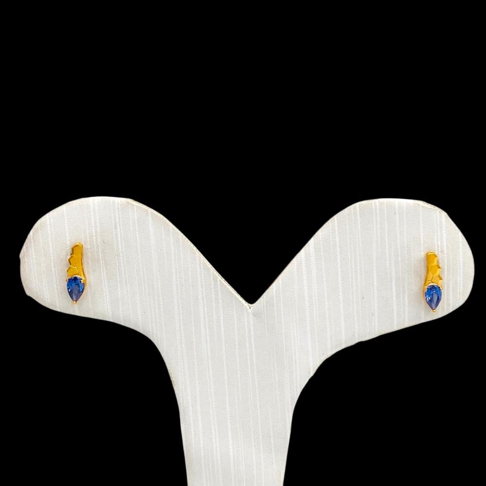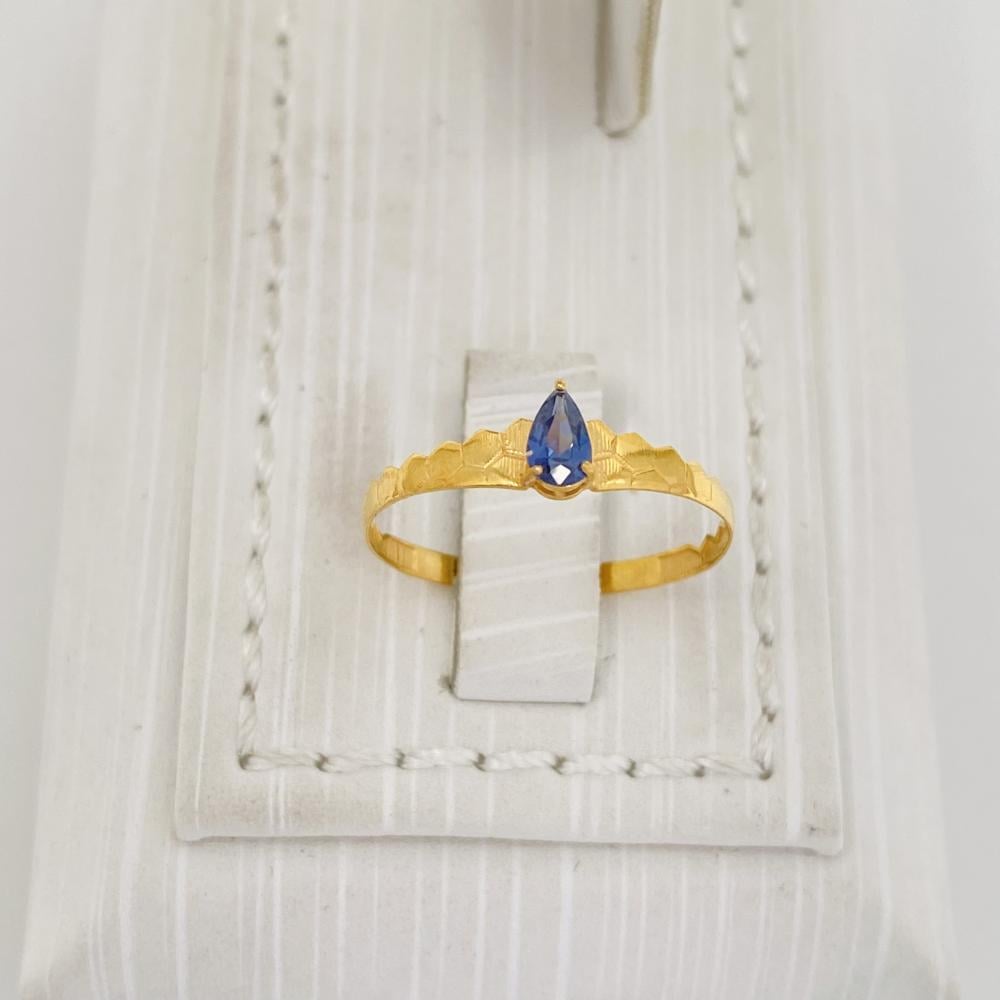 يزيّن الطقم فص أزرق بتصميم على شكل قطرة ماء، موزعة بعناية على العقد، الأقراط، والخاتم، مما يضفي لمسة متناغمة من الفخامة والرقي، ويكتمل السوار الذهبي بتصميم أنيق مماثل، ليكون خيارًا مثاليًا لمن تبحث عن إطلالة فاخرة تترك انطباعًا مميزًا في أي مناسبة.