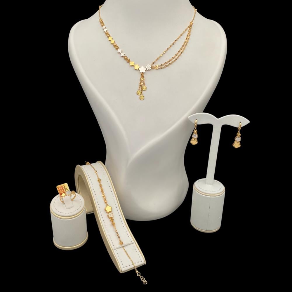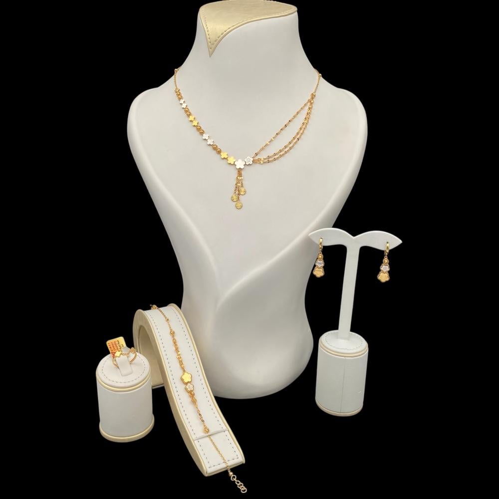 يتميز طقم الذهب عيار 18 بلونه الدافئ اللامع الذي يجمع بين الفخامة والجاذبية، مما يجعله خيارًا مثاليًا للمناسبات الرسمية والكاجوال على حد سواء.