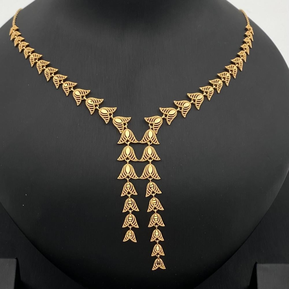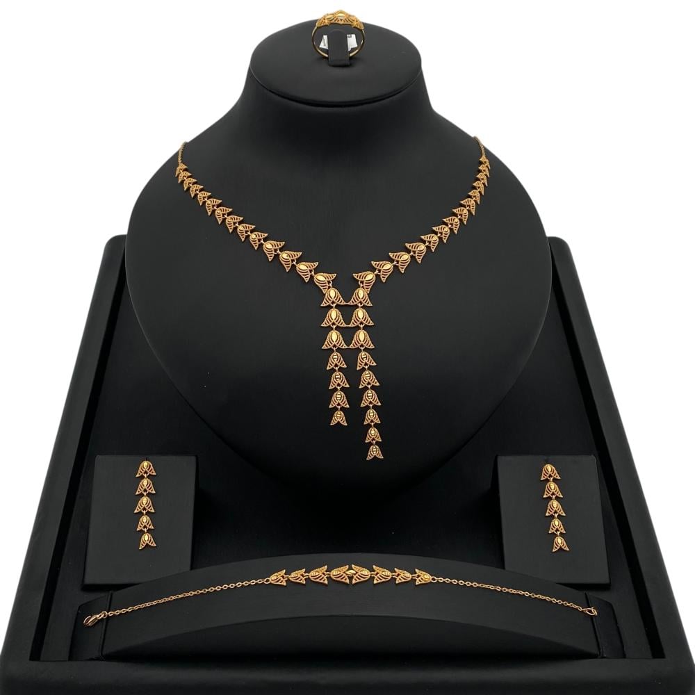 هذا الطقم الفخم من الذهب عيار 21 هو عنوان الفخامة والجمال. يتميز بتصميم خيالي وتفاصيل جميلة تعكس أناقتك وذوقك الرفيع. يتكون الطقم من قطع مميزة تجعلك تبدين بأبهى حلة وتلفتي الأنظار إليك. احصلي على هذا الطقم الراقي وأضيفي لمسة من الجمال والأناقة إلى إطلالتك.