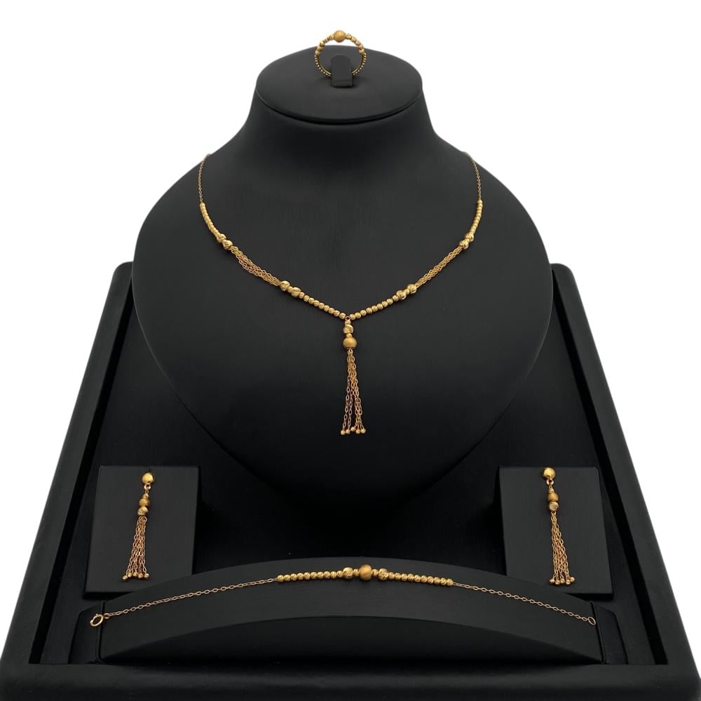 يتسم طقم الذهب عيار 21 بوزن 11.63 جرام بتصميمه العصري والبسيط الذي يناسب جميع الأذواق والمناسبات. يتضمن الطقم العديد من القطع التي تتناغم مع بعضها البعض، مما يتيح لك التنسيق بين القطع بسهولة، سواء كنتِ تريدين إطلالة عصرية أو كلاسيكية.