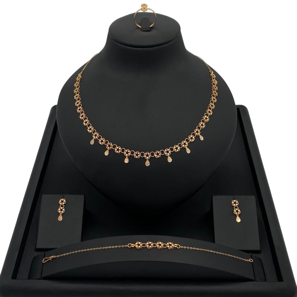يتكون هذا الطقم الفاخر من قطع مصنوعة من الذهب عيار 21، الوزن11.77 جرام والتي تعكس ذوقك الرفيع وتضفي لمسة من الفخامة على إطلالتك اليومية. احصلي على هذا الطقم الراقي وانطلقي بثقة وأناقة لا مثيل لها في كل مناسبة تحضرينها. سيكون هذا الطقم إضافة رائعة لمجموعة مجوهراتك، وسيبرز جمالك وأناقتك بشكل متألق.