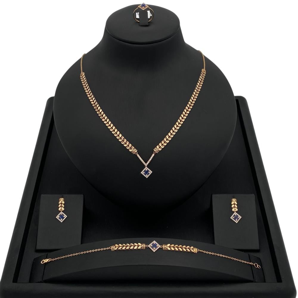 هذا الطقم الجميل من الذهب عيار 21 يأتي بوزن 11.97 جرام، ويحتوي على قطع مميزة بتصميم خيالي وتفاصيل جميلة جداً. صُمم هذا الطقم ليعبر عن أناقة لا مثيل لها تليق بك سيدتي. احصلي على هذه القطع الراقية وتألقي بإطلالة مميزة وجذابة تجعلك تبرزين بين الحضور.
