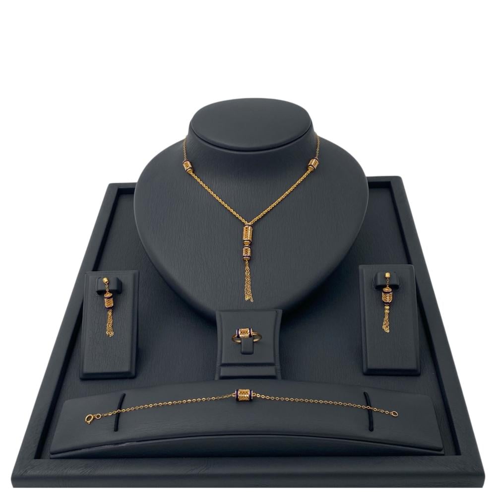 اختاري طقم ذهب عيار 21 لمناسباتك الخاصة، يتميز هذا الطقم بتصميم راقي وأنيق يبرز جمالك ويضيف لمسة من السحر والأناقة إلى إطلالتك. يتكون الطقم من قطع فاخرة مصنوعة بدقة واهتمام بالتفاصيل، حيث يتميز بجودة عالية ولمعان رائع يجعله مثالياً للارتداء في المناسبات الخاصة. احصلي على هذا الطقم الفريد وارتديه لتتألقي بأناقة لا مثيل لها وتبهري الجميع بجمالك وأناقتك.