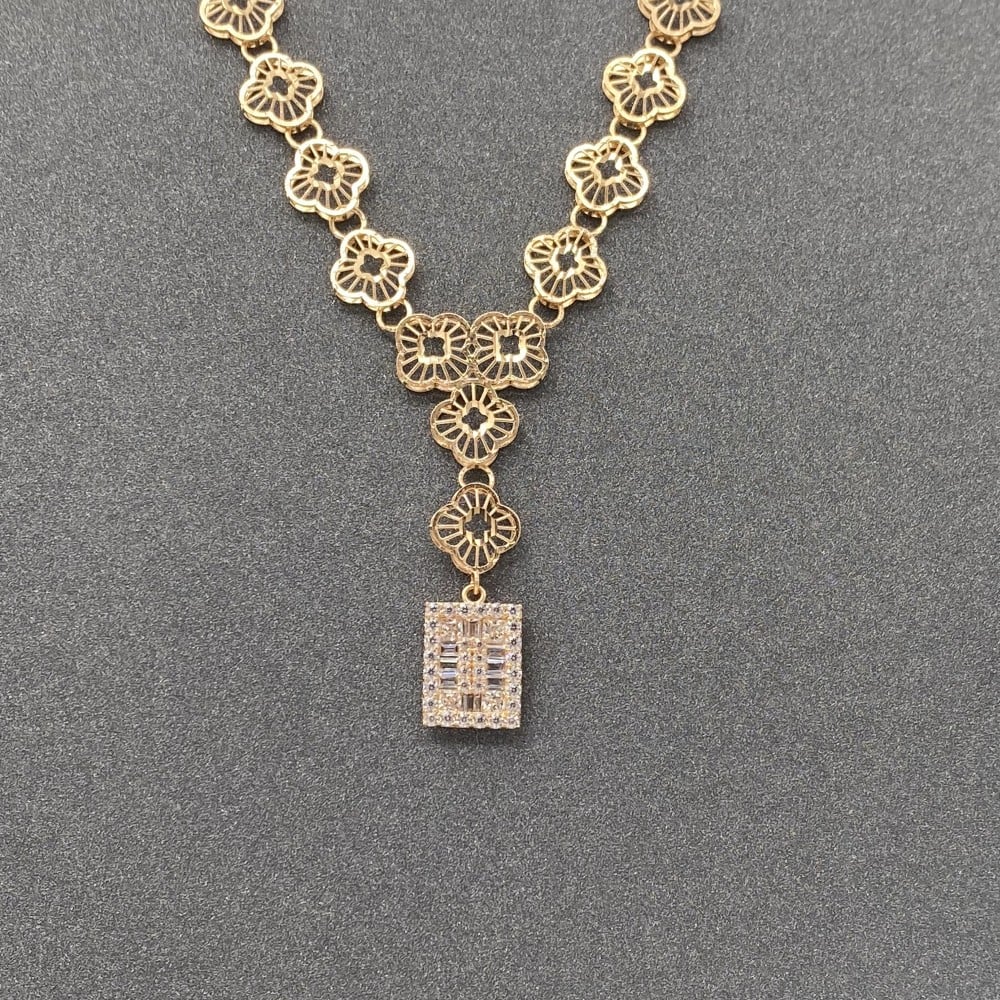 احصلي اليوم على طقم ذهب عيار 21 الراقي المكون من قطع فاخرة بتصميم يعكس أناقتك وذوقك الرفيع. يأتي الطقم بوزن 15,2 جرام، مما يجعله قطعة انيقة ومميزة تضيف لمسة من الجمال والأناقة لإطلالتك. لا تفوتي الفرصة لامتلاك هذا الطقم الذهبي الفاخر واضافته الى مجموعتك الثمينة.