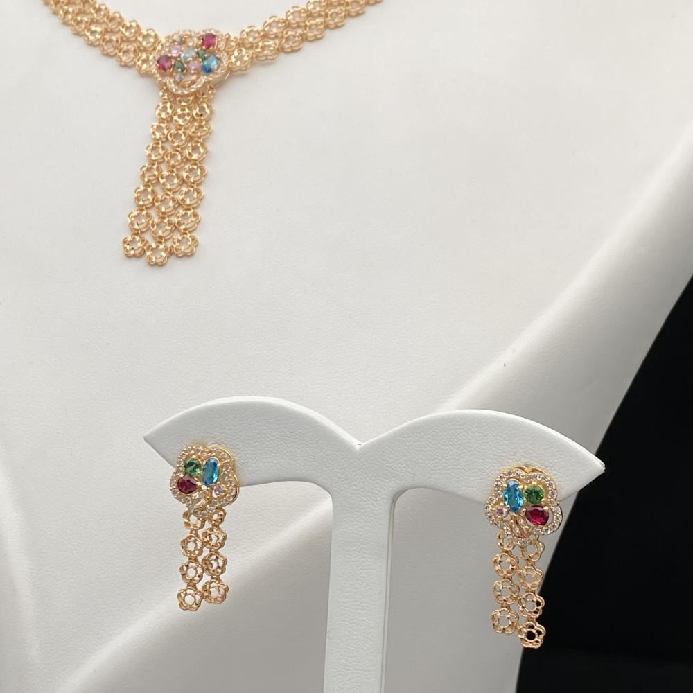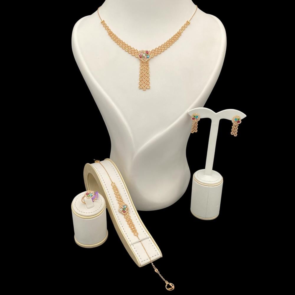 الذهب عيار 21 هو أحد أكثر الأنواع استخدامًا في صناعة المجوهرات، حيث يحتوي على 87.5% من الذهب النقي و12.5% من المعادن الأخرى مثل الفضة والنحاس. يعتبر هذا العيار من الذهب مثاليًا لكونه يحتفظ بجماله وبريقه بينما يتمتع بصلابة أعلى من الذهب الخالص، ما يجعله مناسبًا لصناعة المجوهرات اليومية التي يمكن أن تدوم لفترة طويلة. بفضل محتواه العالي من الذهب، يعتبر هذا الطقم من المجوهرات الثمينة التي تحافظ على قيمتها بمرور الوقت.
