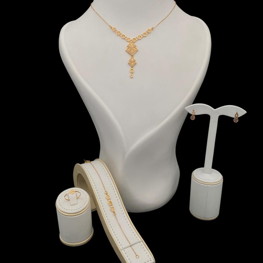 هذا الطقم الذهبي عيار 21 الوزن 7.17 جرام هو الاختيار المثالي للمرأة التي تبحث عن التميز والأناقة. تتميز القطع الفاخرة في هذا الطقم بتصميم خيالي وتفاصيل جميلة تعكس الأناقة والجمال . تم صناعة هذا الطقم ليعبر عن أناقتك ويضيف لمسة راقية إلى إطلالتك. احصلي على هذه القطع الراقية الآن واستمتعي بالتألق والأناقة التي لا مثيل لها!