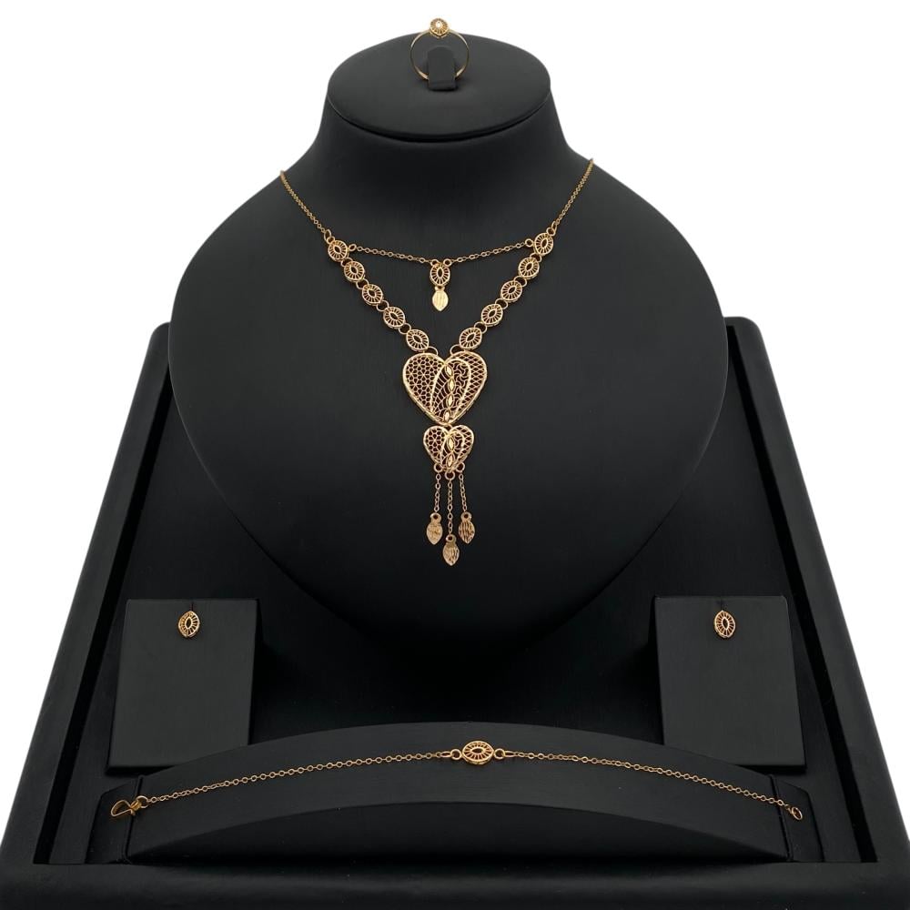 يتميز طقم الذهب عيار 21 بوزن 8.54 جرام بتصميم فريد وفاخر يجذب الانتباه. يتضمن هذا الطقم قطعًا رائعة بتفاصيل مذهلة تعكس جمالًا لا مثيل له. صُممت هذه القطع لتعكس رونقًا ساحرًا يليق بك ويضفي لمسة أنيقة ومميزة على إطلالتك. احصلي على هذا الطقم الراقي وامنحي نفسك فرصة التألق بأناقة لا تضاهى!