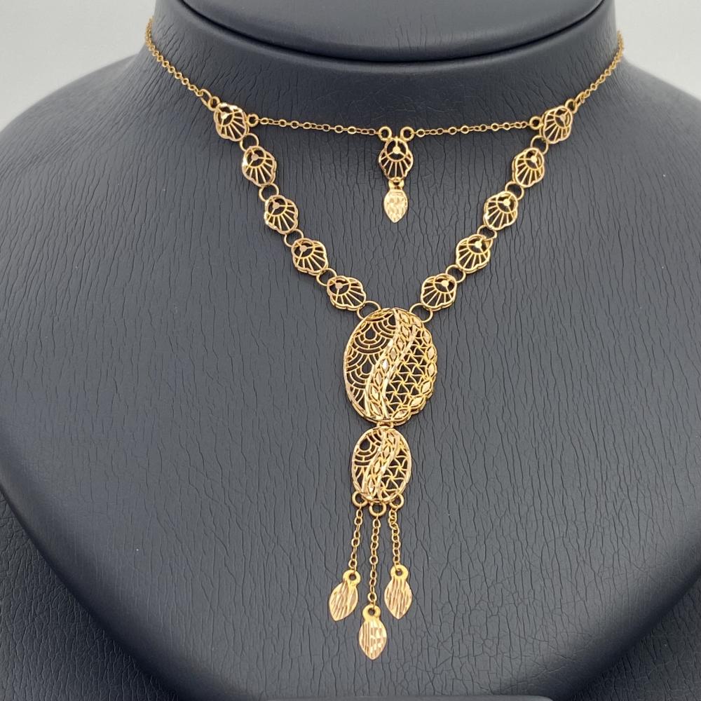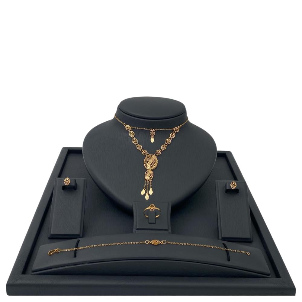 طقم ذهب عيار 21 وزن 8.8 جم بتصميم بيضاوي وتفاصيل نادرة مزخرفة وفصوص متدلية بلمسات ناعمة