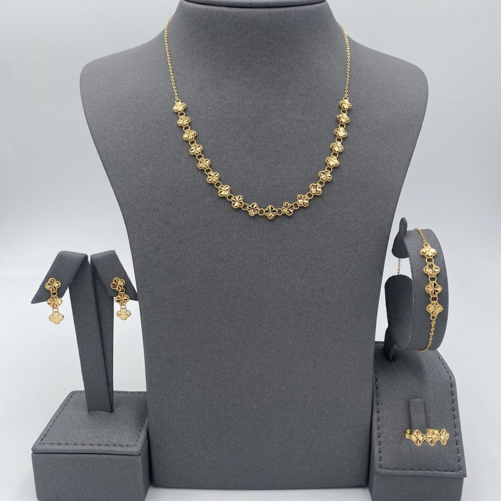 - التنظيف المنتظم: قومي بتنظيف الطقم باستخدام ماء دافئ وصابون خفيف وفرشاة ناعمة لإزالة الأوساخ. يجب تجنب المواد الكيميائية القوية التي قد تؤثر على لمعان الذهب.