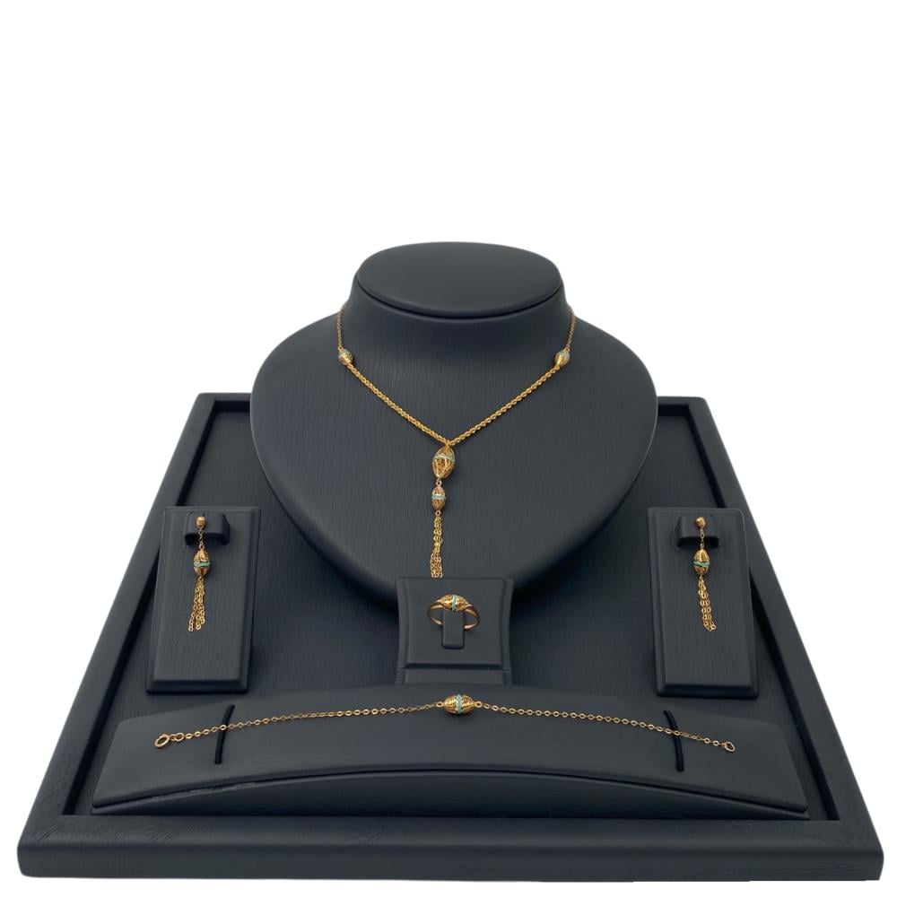 - تزين الخرزات الذهبية تفاصيل دقيقة باللون الفيروزي، مما يضيف لمسة من الجمال الطبيعي، ويعزز من جاذبية الطقم.
