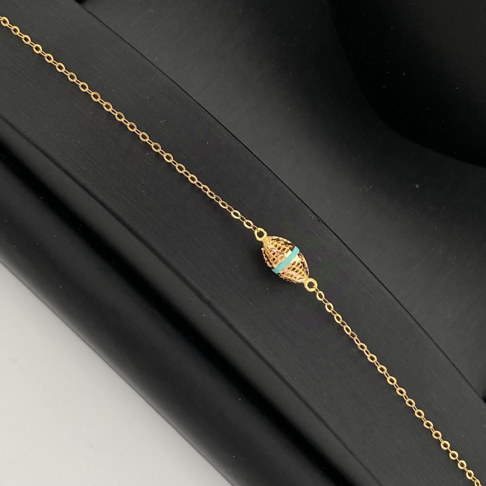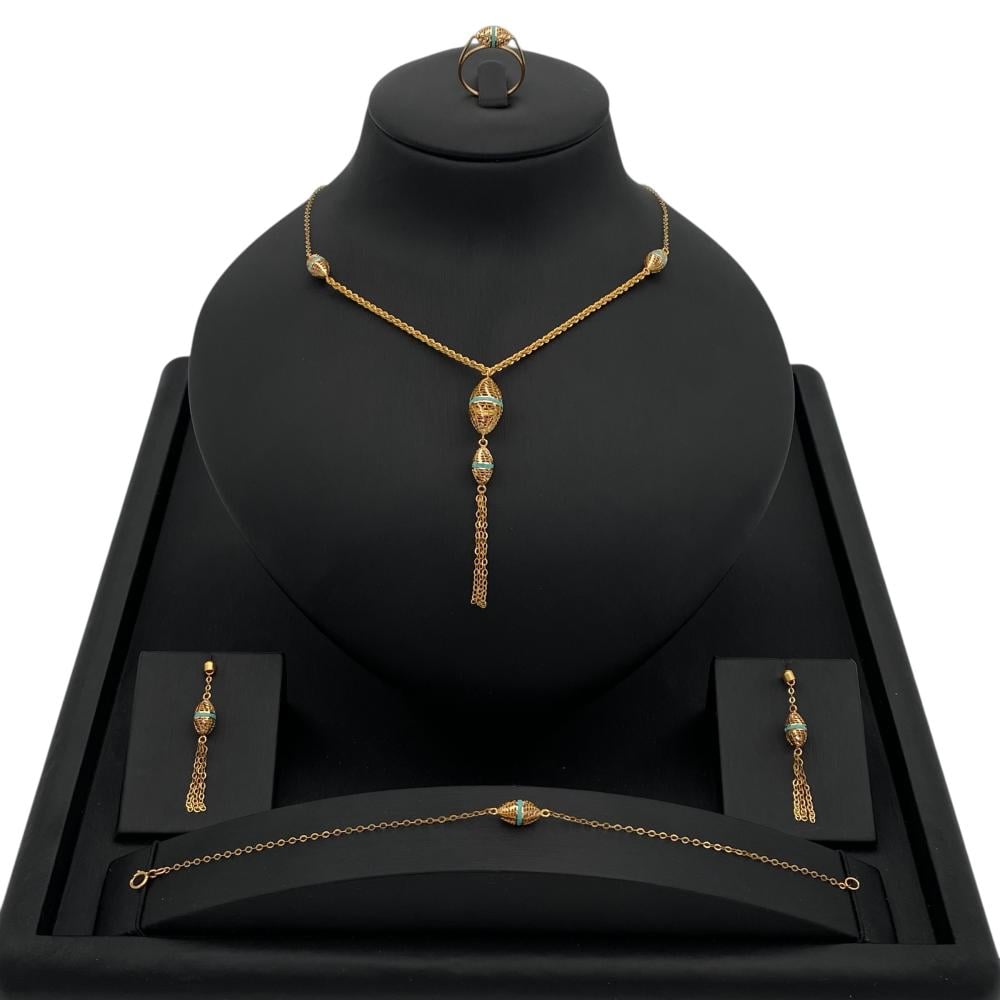 • تزين الخرزات الذهبية تفاصيل دقيقة باللون الفيروزي، مما يضيف لمسة من الجمال الطبيعي، ويعزز من جاذبية الطقم.