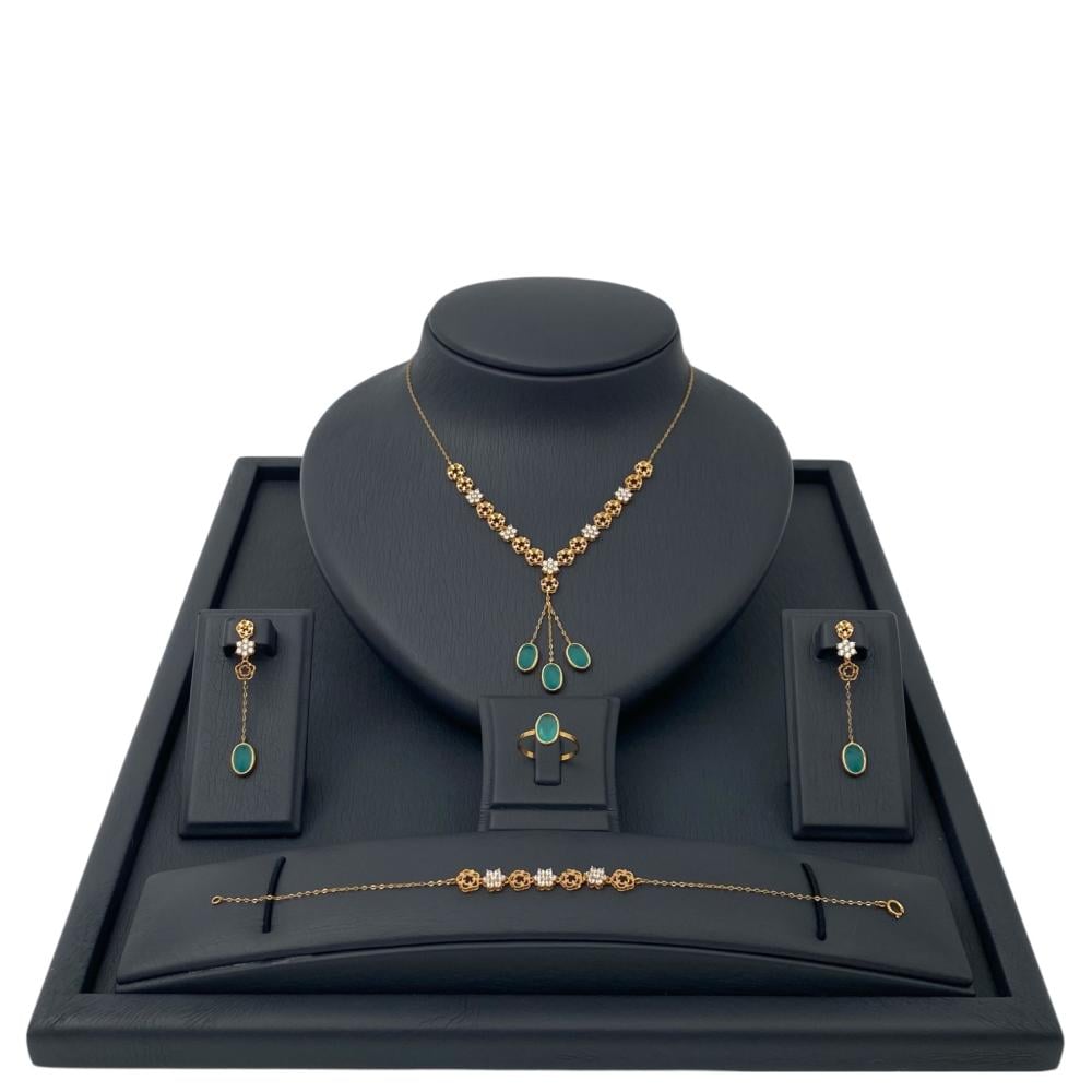 يُجسّد هذا الطقم الفاخر من متجر قمة زاوية الشفاء افضل متجر ذهب في السعودية والخليج مزيجًا رائعًا بين الذهب الأصفر الفخم والأحجار الكريمة الخضراء، ليمنح إطلالة راقية تعكس الأناقة الكلاسيكية. يتميز العقد بتصميم متناسق من الزخارف الذهبية المستوحاة من أشكال الزهور، تتخللها فواصل لامعة وانيقة، مع ثلاث أحجار بيضاوية خضراء تتدلى بأسلوب فاخر يعزز من رونقه.