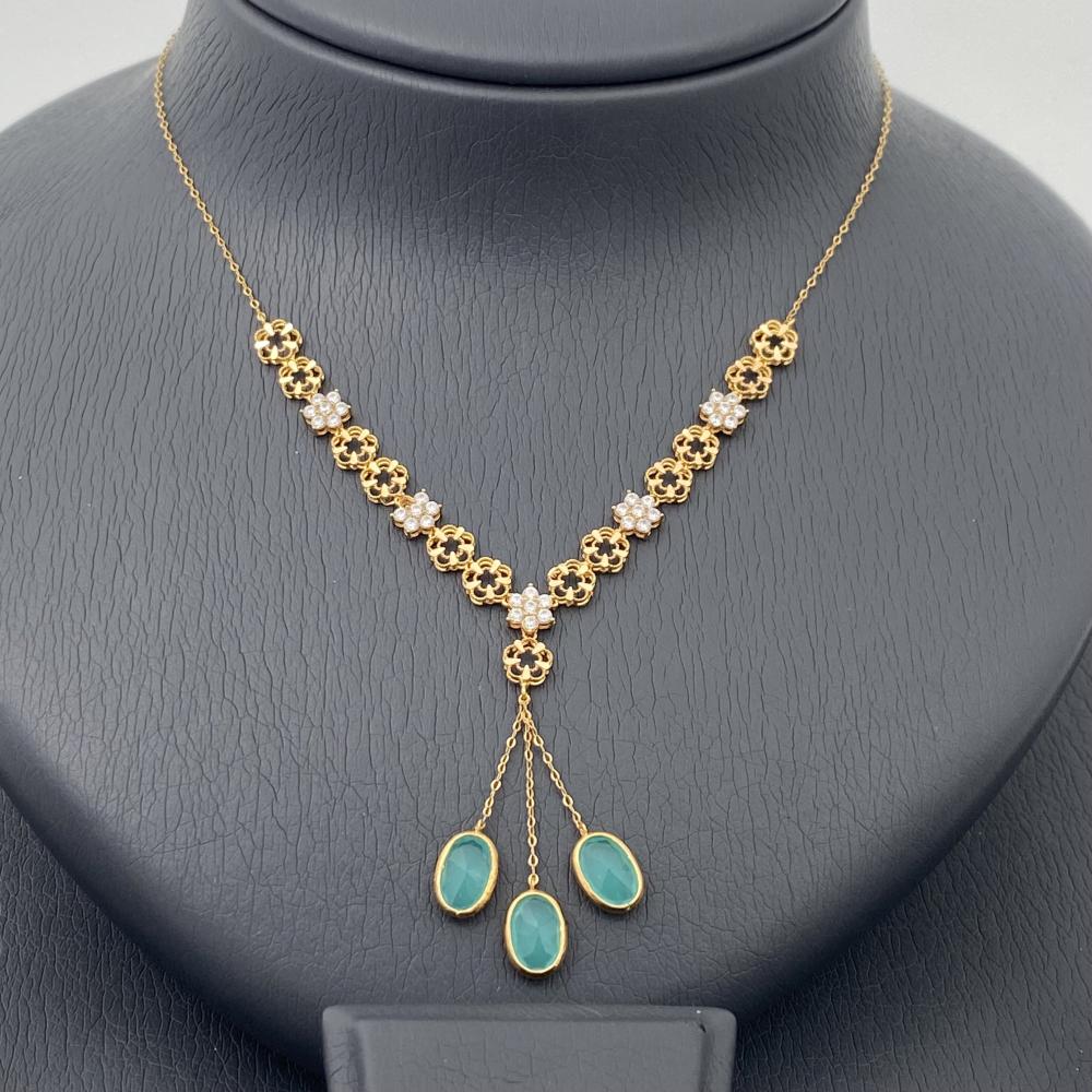 - ثلاثة أحجار باللون الأخضر في القلادة، تمنح الطقم لمسة أنثوية راقية.