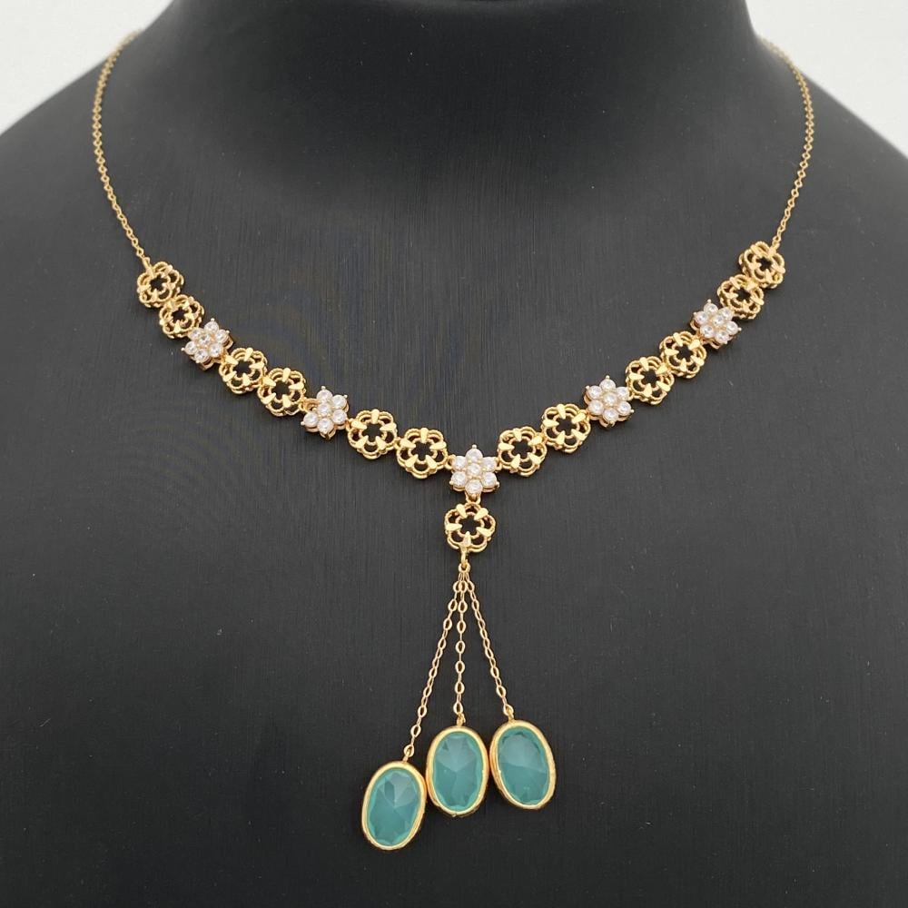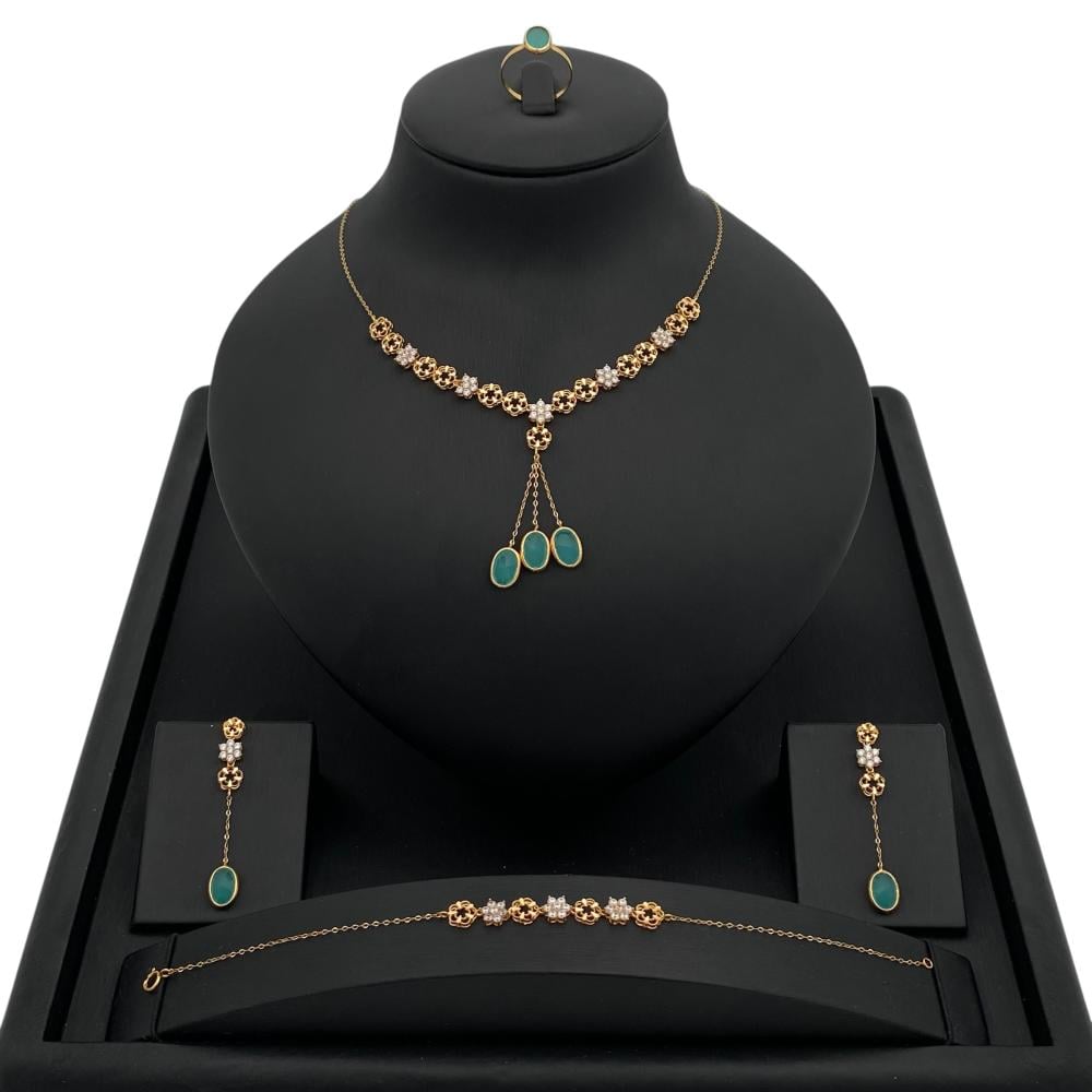 يُجسّد هذا الطقم الفاخر من متجر قمة زاوية الشفاء افضل متجر ذهب في السعودية والخليج مزيجًا رائعًا بين الذهب الأصفر الفخم والأحجار الكريمة الخضراء، ليمنح إطلالة راقية تعكس الأناقة الكلاسيكية. يتميز العقد بتصميم متناسق من الزخارف الذهبية المستوحاة من أشكال الزهور، تتخللها فواصل لامعة وانيقة، مع ثلاث أحجار بيضاوية خضراء تتدلى بأسلوب فاخر يعزز من رونقه.