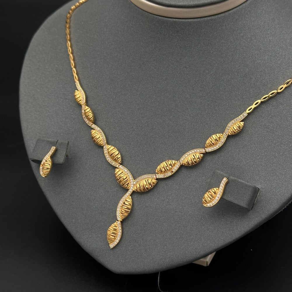 يجمع طقم الذهب هذا بين التصميم الكلاسيكي والحداثة، فهو مصمم بطريقة مبتكرة تجمع بين الأناقة والبساطة في نفس الوقت. تشتمل المجموعة على قلادة وأقراط متناسقة تتميز بتفاصيل مميزة ودقة في الصنع، مما يجعلها مثالية للنساء اللواتي يتطلعن إلى إكمال إطلالتهن بطريقة متميزة.