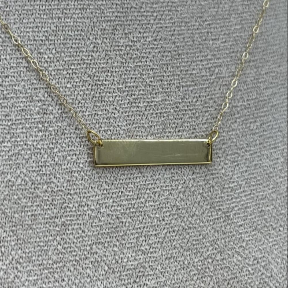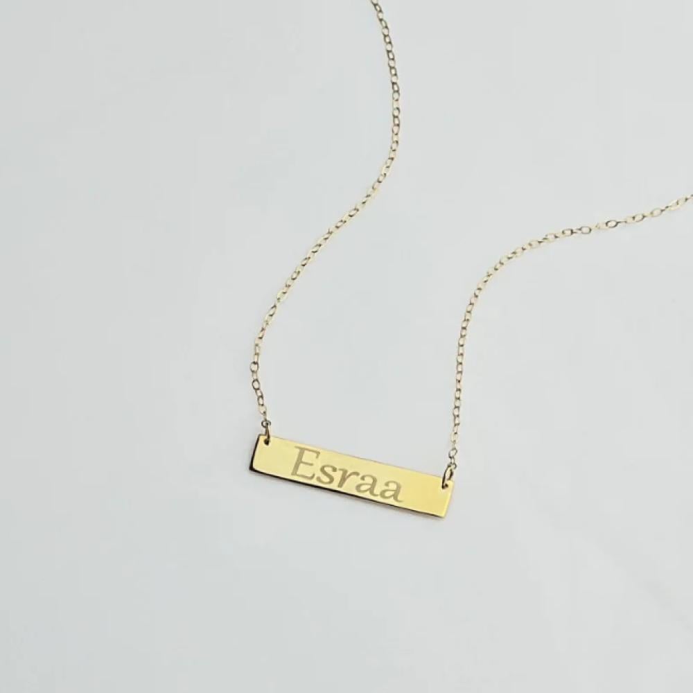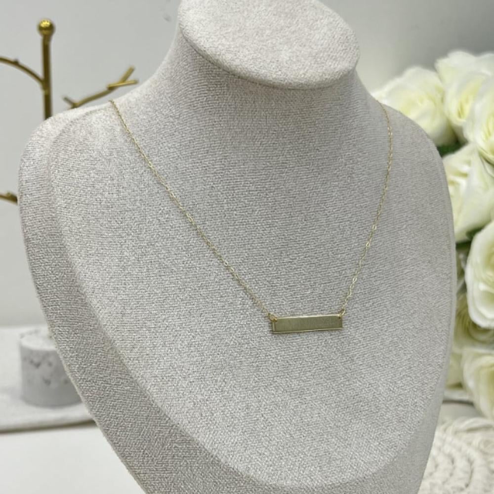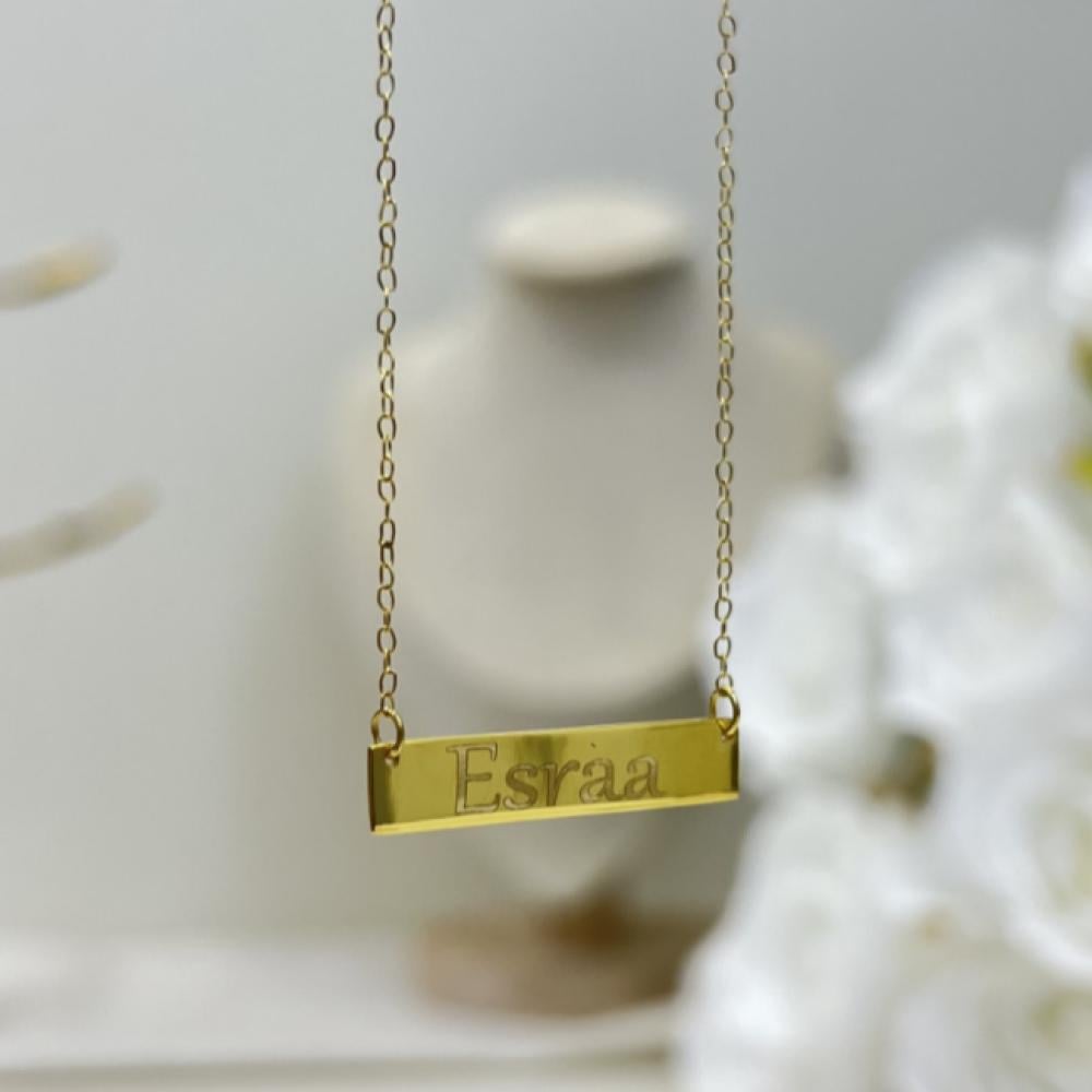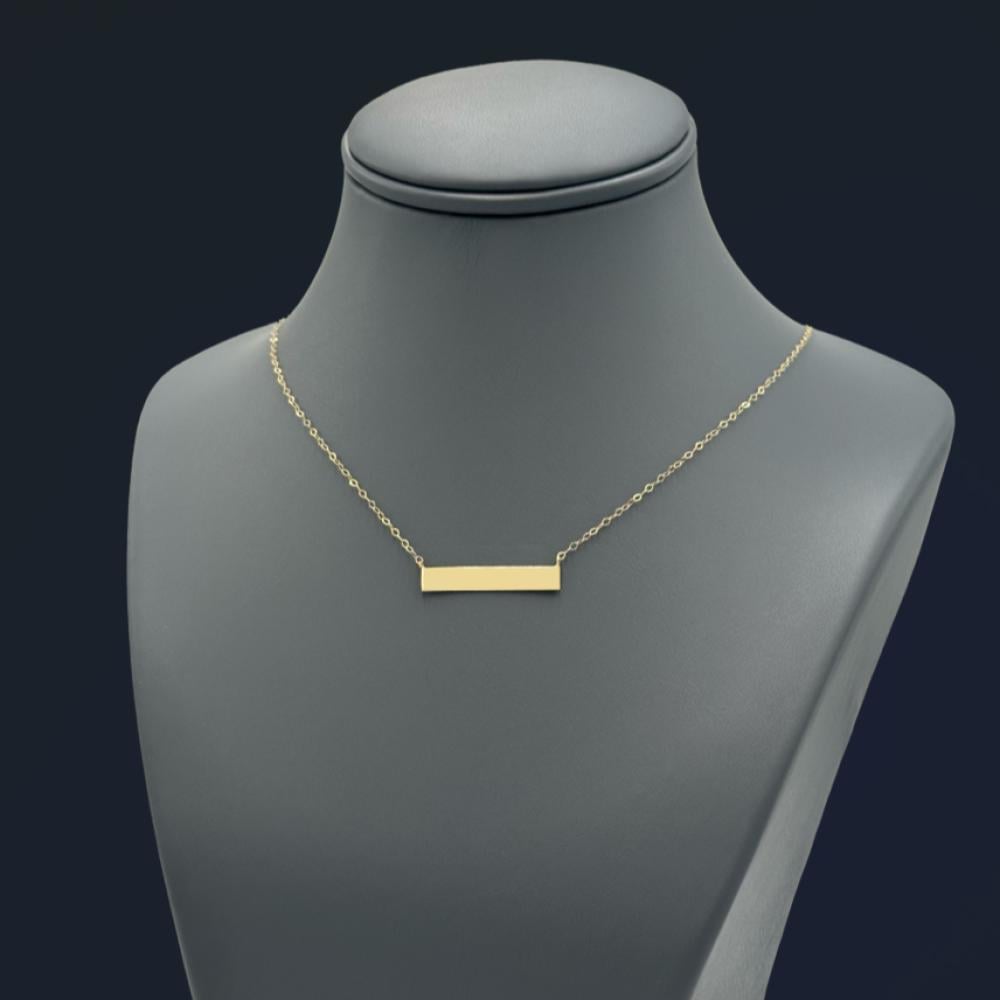 عبّري عن أناقتك بأسلوب أنثوي ناعم مع قلادة ذهب بتصميم البار المربع المصقول، يُنقش عليها اسمك بدقة عالية وخط أنيق حسب الطلب، من متجر قمة زاوية الشفاء للذهب والمجوهرات، نقدم لكِ قطعة مجوهرات بسيطة في شكلها، عميقة في معناها، تكمّل إطلالتك اليومية أو تصبح هدية خالدة لمن تحبين.