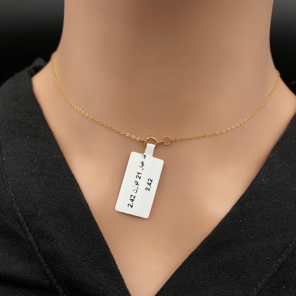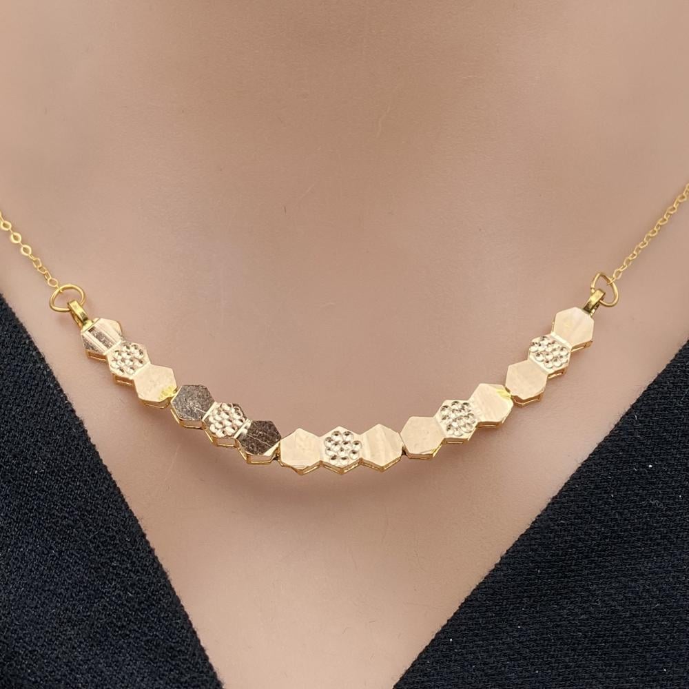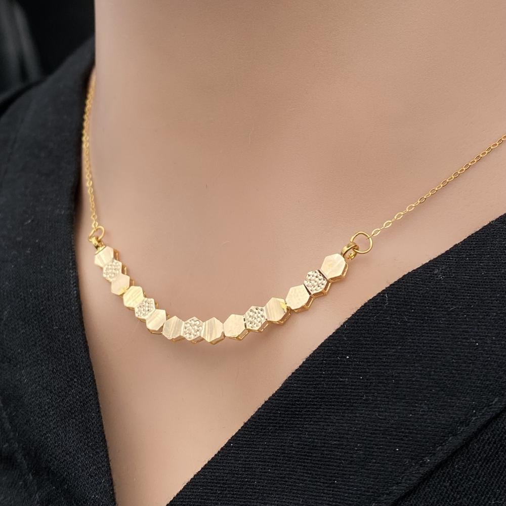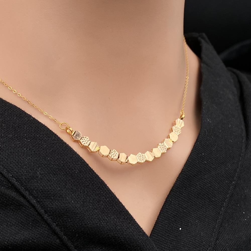هذا العقد مصنوع من ذهب عيار 21، وهو من أكثر الأعيرة انتشارًا في صناعة المجوهرات نظرًا لتوازنه المثالي بين النقاء والمتانة. بوزن 2.42 جرام، يتميز هذا العقد بخفته على العنق مع مظهر فاخر يليق بجميع المناسبات.