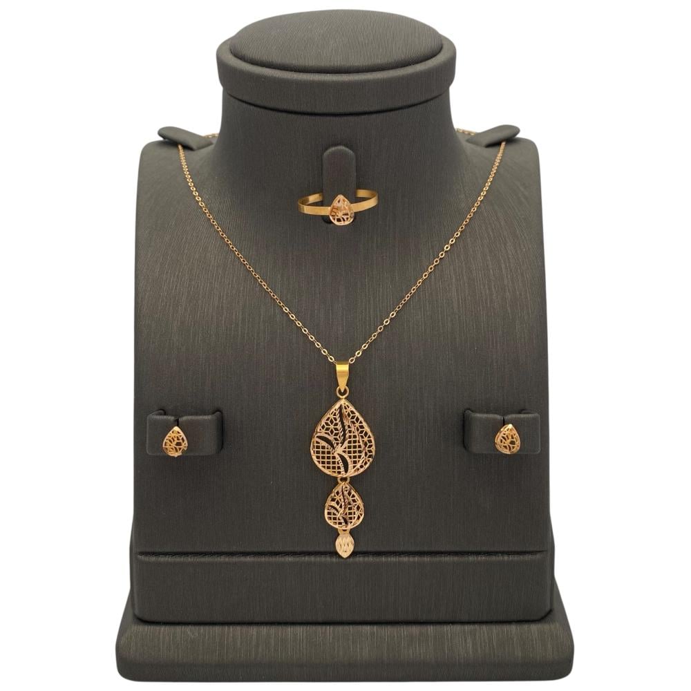 هذا النصف من طقم الذهب بعيار 21 وزنه 3.98 جرام يشمل قطع فريدة تضفي لمسة من الأناقة والفخامة إلى مظهرك. مصنوعة من الذهب عالي الجودة وتصميم أنيق ومتقن يجعلها قطعة مثالية لتكملي بها إطلالتك. احصلي عليه الآن من متجر قمة الزاوية للذهب والمجوهرات الراقية واستمتعي بإطلالة ساحرة ومميزة.