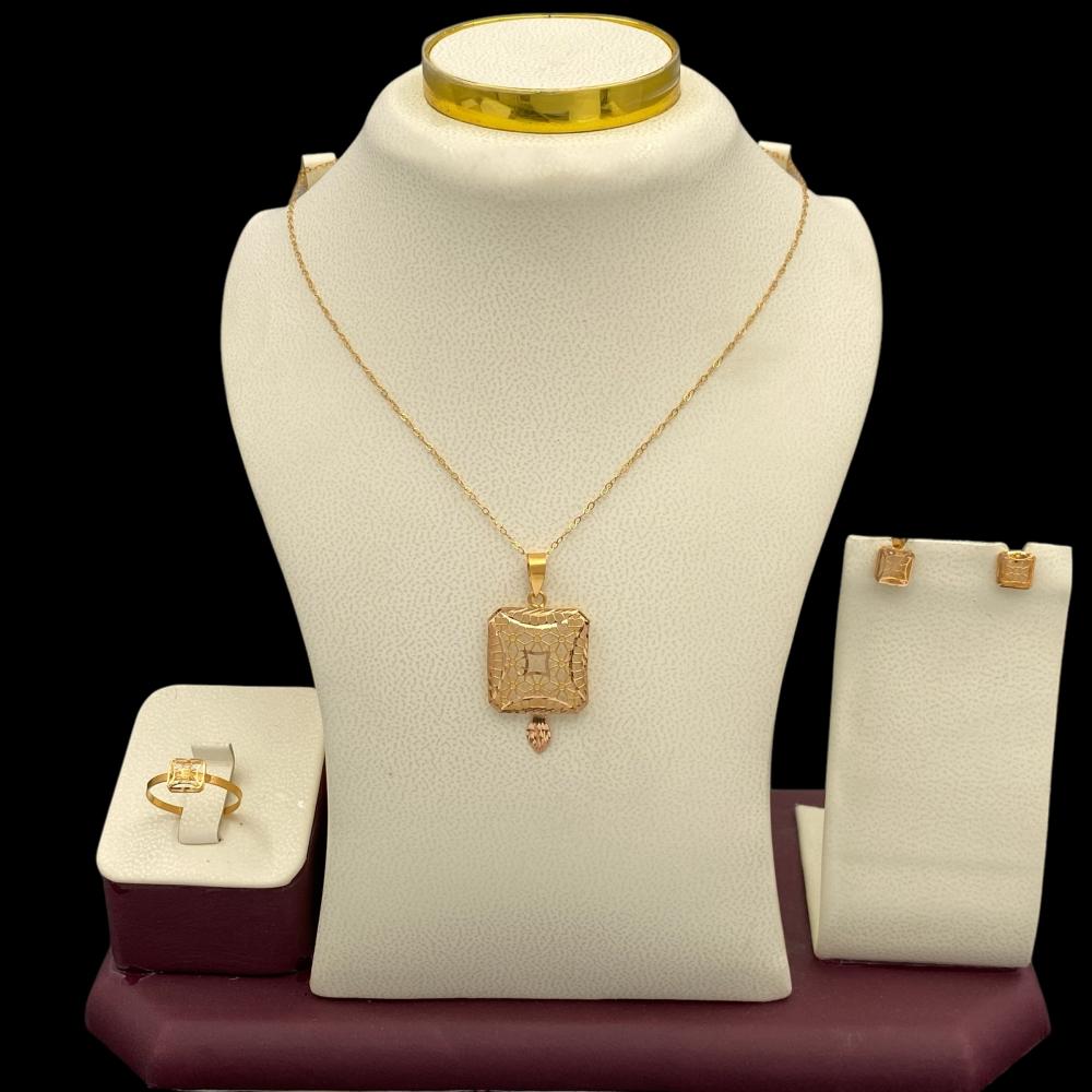هذا النصف طقم الذهب عيار 21 الذي يزن 4 جرام يتميز بقطع فاخرة تعزز جمالك وجاذبيتك. تمتعي بإطلالة أنيقة ومميزة مع هذه القطع الراقية وأضيفي لمسة من الأناقة إلى إطلالتك. احصلي عليها الآن وتألقي بإطلالة متألقة وساحرة!