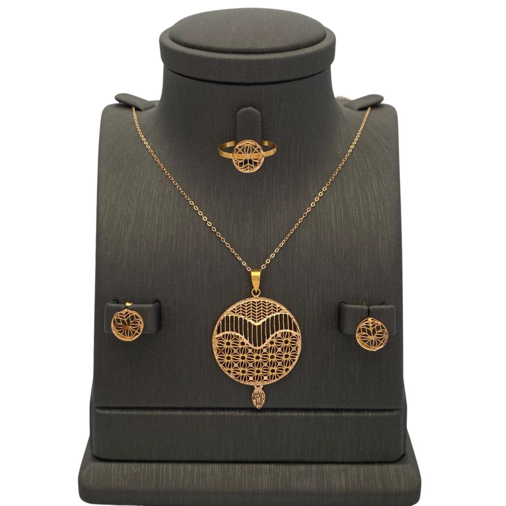 نصف طقم ذهب عيار 21 الوزن 4.9 جرام يشمل قطع فاخرة تزيدك جمال وجاذبية. احصلى على هذة القطع الراقية واضيفى لمسة من الأناقة إلى إطلالتك! يبهر هذا الطقم الجميل العيون وينقش قصة أناقة لا تنسى. ستكونين محط الأنظار بإرتدائك هذا الطقم الراقي، فلا تترددي في إضافته إلى مجموعتك الذهبية.