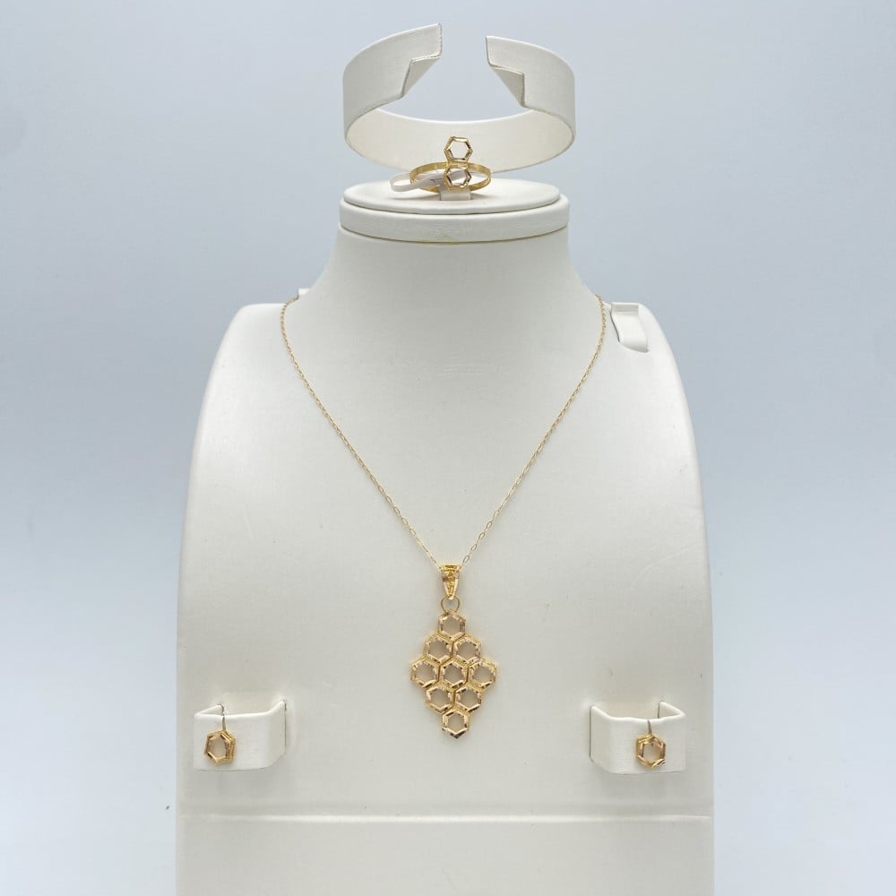الذهب عيار 21 هو نوع من الذهب النقي الذي يحتوي على 87.5% من الذهب الخالص. يتميز هذا العيار بمزيج مثالي بين النقاء والمتانة، ما يجعله مناسبًا لصناعة المجوهرات التي تحتاج إلى القوة مع الحفاظ على جمالها. بوزن 4.7 جرام، يعتبر نصف الطقم خفيفًا بما يكفي ليوفر الراحة أثناء ارتدائه، ولكنه في نفس الوقت يوفر الحجم المثالي لإطلالة لافتة.