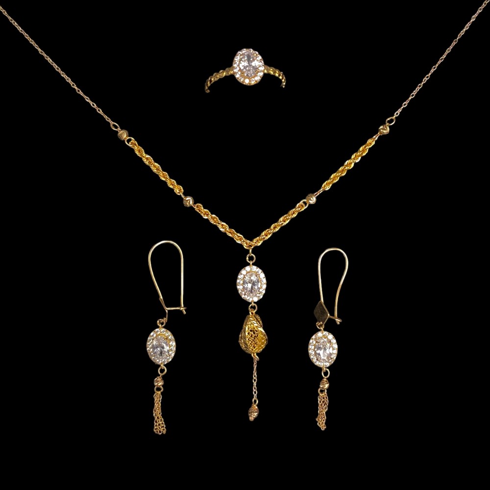 اكتشفي نصف طقم الذهب عيار 21 الذي يبث جمالًا ورونقًا لا مثيل له، مما يساعدك على إبراز أناقتك وجاذبيتك كامرأة عصرية. يتضمن هذا الطقم الفاخر قطعًا مميزة تعكس حيوية وأناقة المرأة العصرية. أضيفي لمسة من الأناقة الراقية إلى إطلالتك مع هذا الطقم الذهبي الرائع واستمتعي بتألق لا مثيل له.