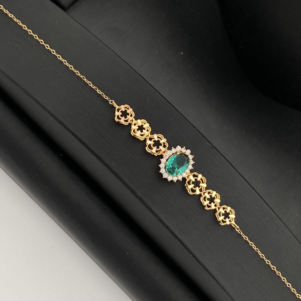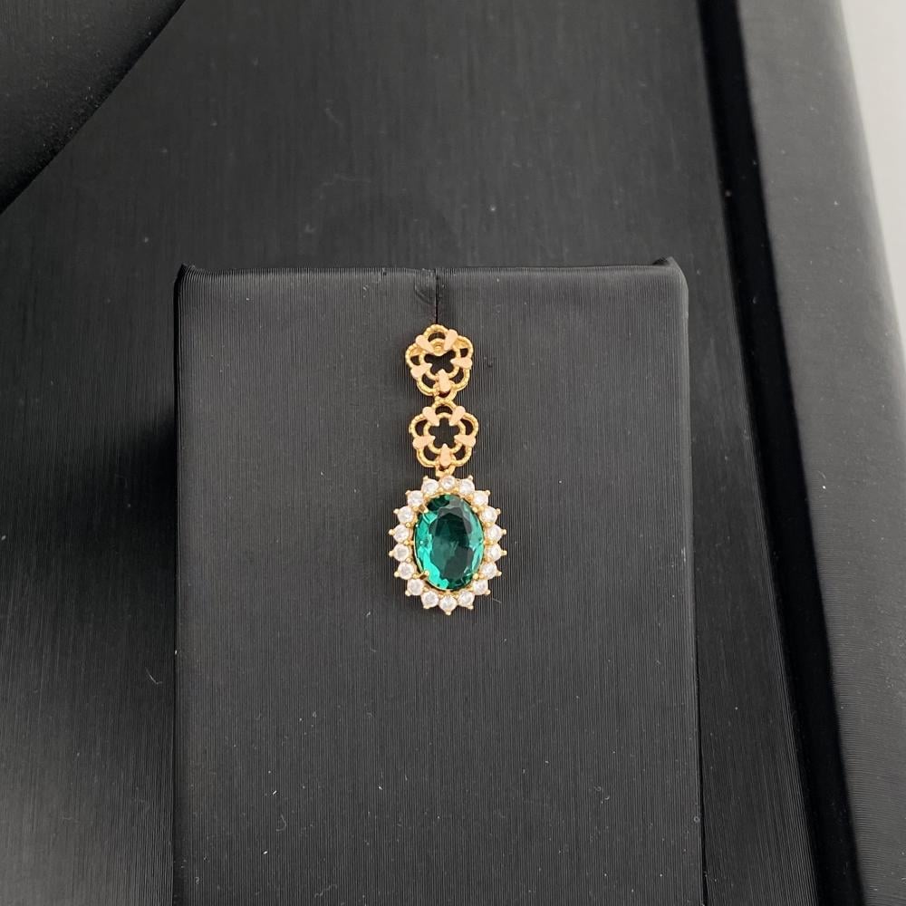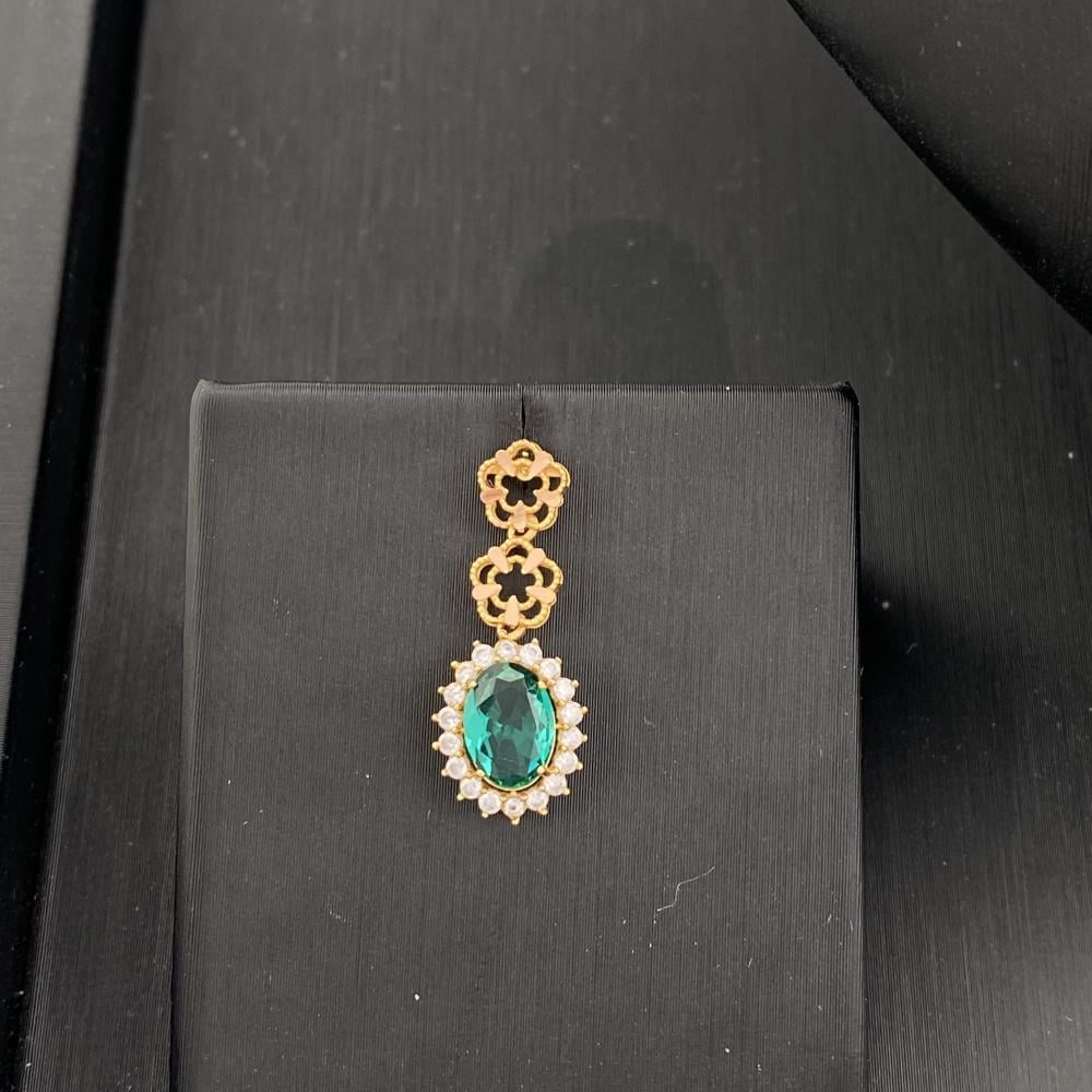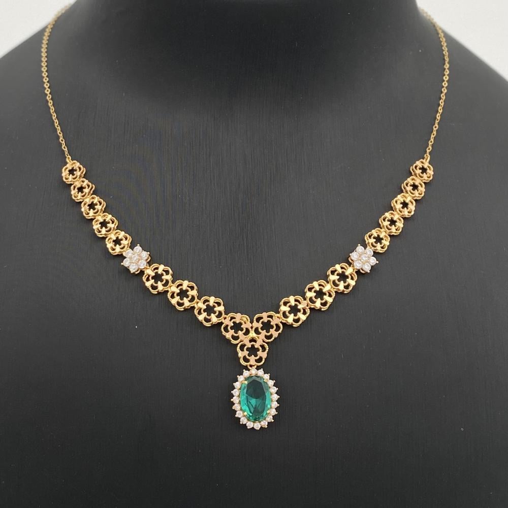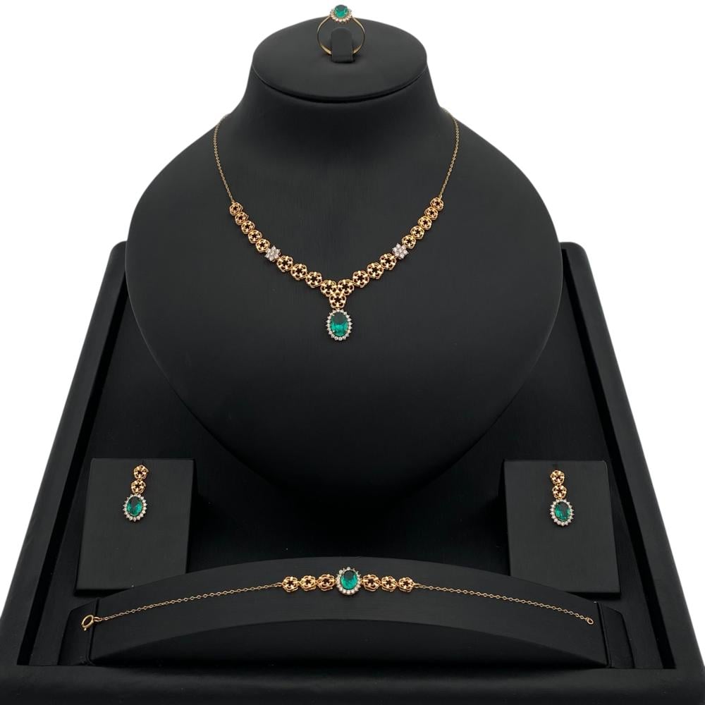 يتميز طقم ذهب عيار 21 بتصميم فاخر وأنيق، بتفاصيل زخرفية على شكل زهور صغيرة متصلة ببعضها البعض، مما يمنحه لمسة أنثوية راقية، ويتوسط العقد حجر بيضاوي الشكل بلون أخضر جذاب، كما يحتوي العقد على تفاصيل راقيه لامعه إضافية موزعة على الجانبين، مما يضيف لمسة من البريق والفخامة إلى التصميم.