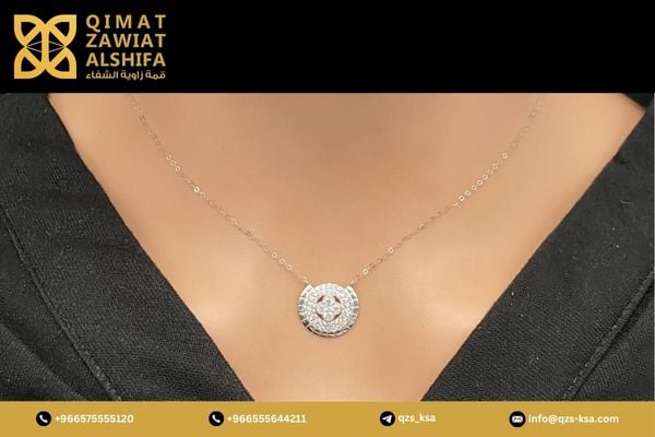 تألقي بـ عقد ذهب أبيض عيار 18 المصمم بأناقة فائقة، متوفر الآن لدى متجر قمة زاوية الشفاء للذهب والمجوهرات