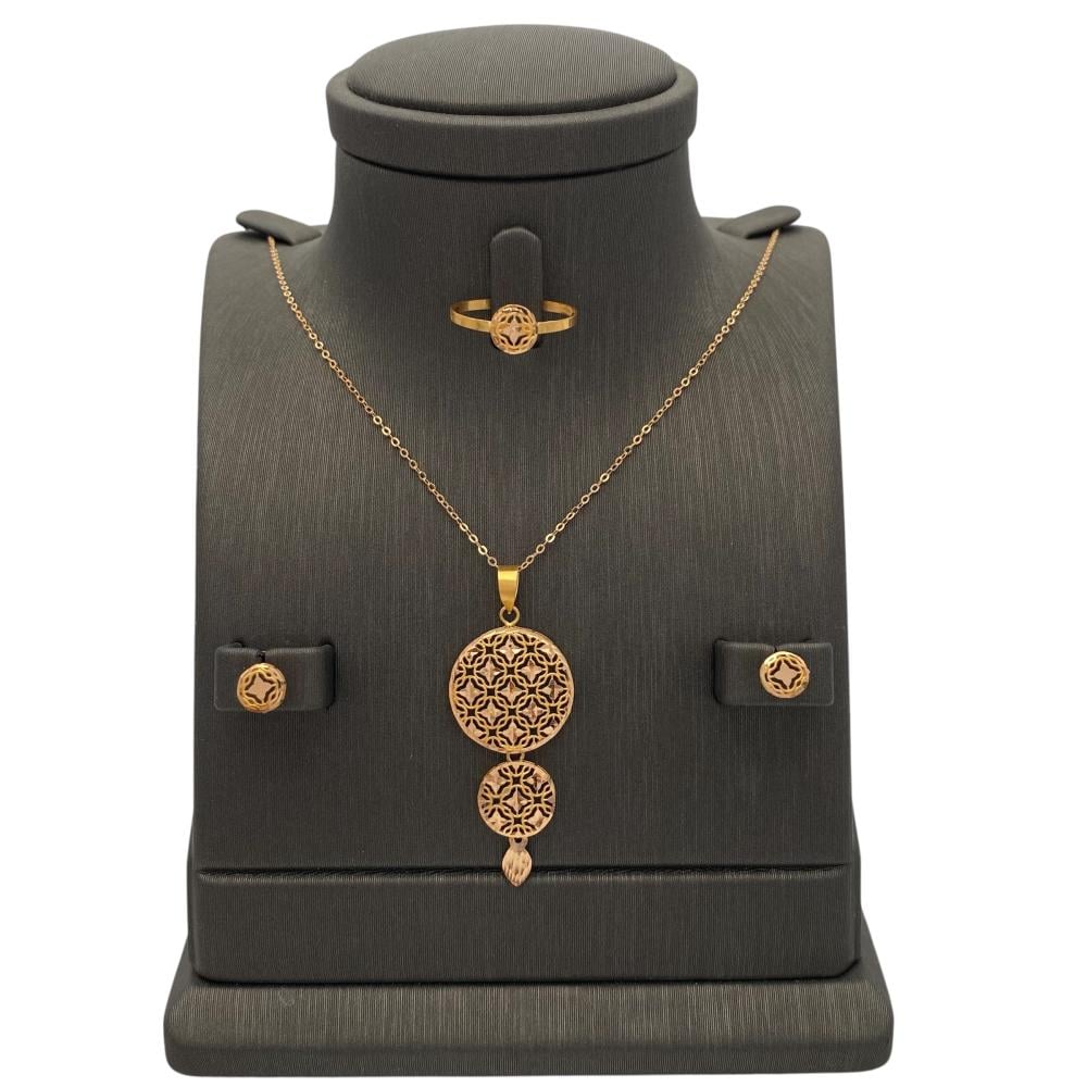 هذا النصف الطقم الذهبي عيار 21 يتميز بتصميم فاخر يضيف لمسة من الجمال والجاذبية إلى إطلالتك. يزن 4.01 جرامات ويشمل قطعًا مميزة تتوهج بلمعة الذهب وتجعلك تبدين بأناقة لا مثيل لها. احصلي على هذا الطقم الراقي وأضيفي لمسة من الأناقة إلى مظهرك!