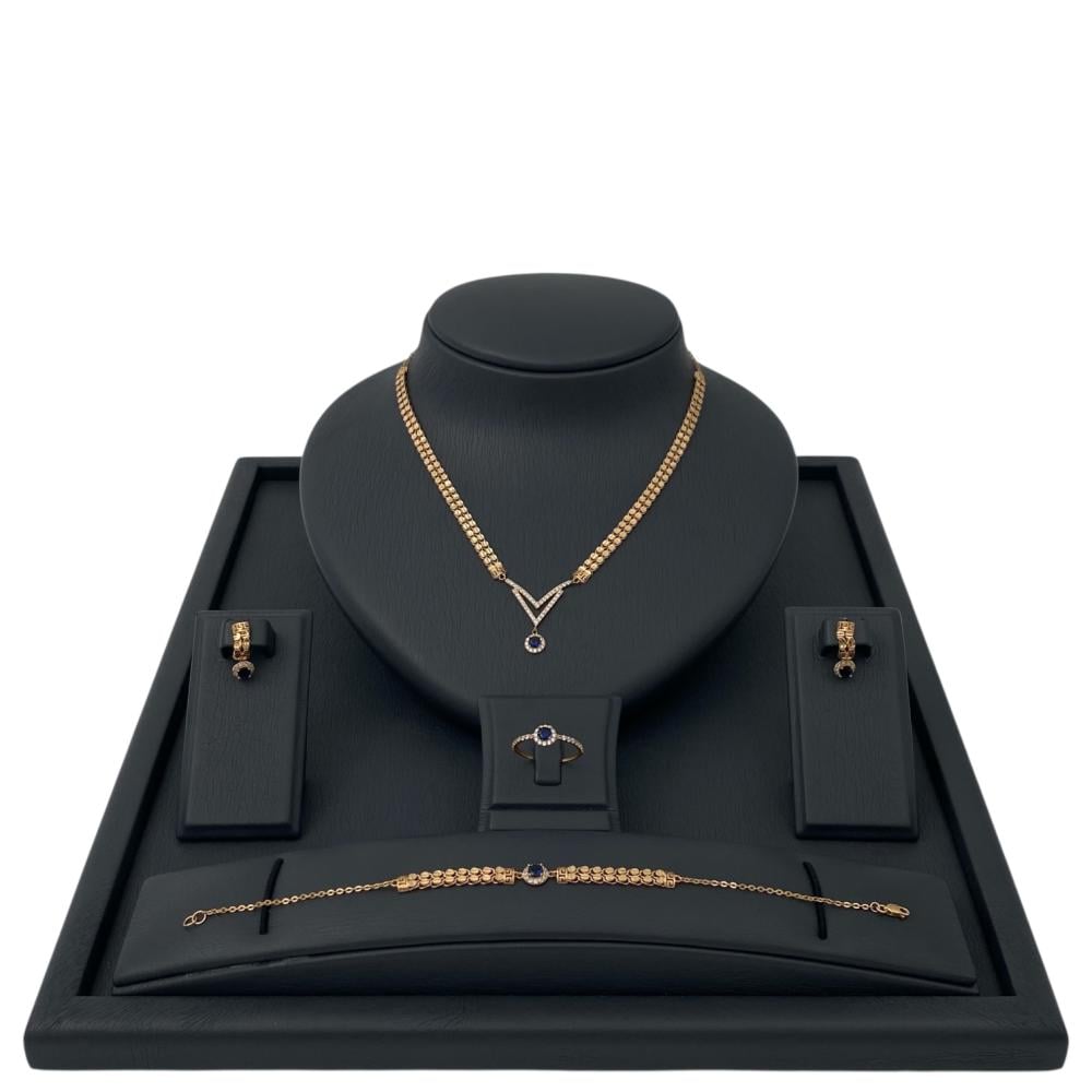 This stunning 21k gold set is a masterpiece that combines exquisite design and beautiful details. The set includes unique and distinctive pieces that will add a touch of elegance and beauty to your look. Get this elegant set and enjoy your elegance and unparalleled beauty. You will dazzle everyone with your charming look in this luxurious set!