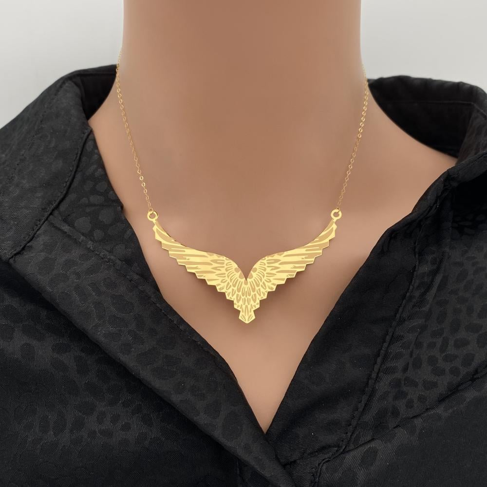 This 21-karat gold falcon wing necklace, weighing 2.4 grams, is a unique piece that exudes strength and luxury. It combines the beauty of its design, the quality of the gold, and the symbolism of the falcon , making it an ideal choice for anyone looking for an exceptional piece that adds a touch of sparkle to their look.