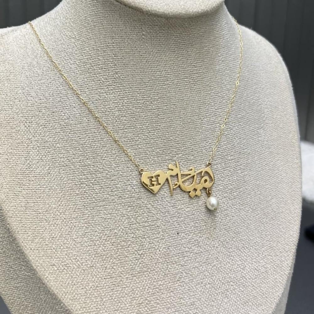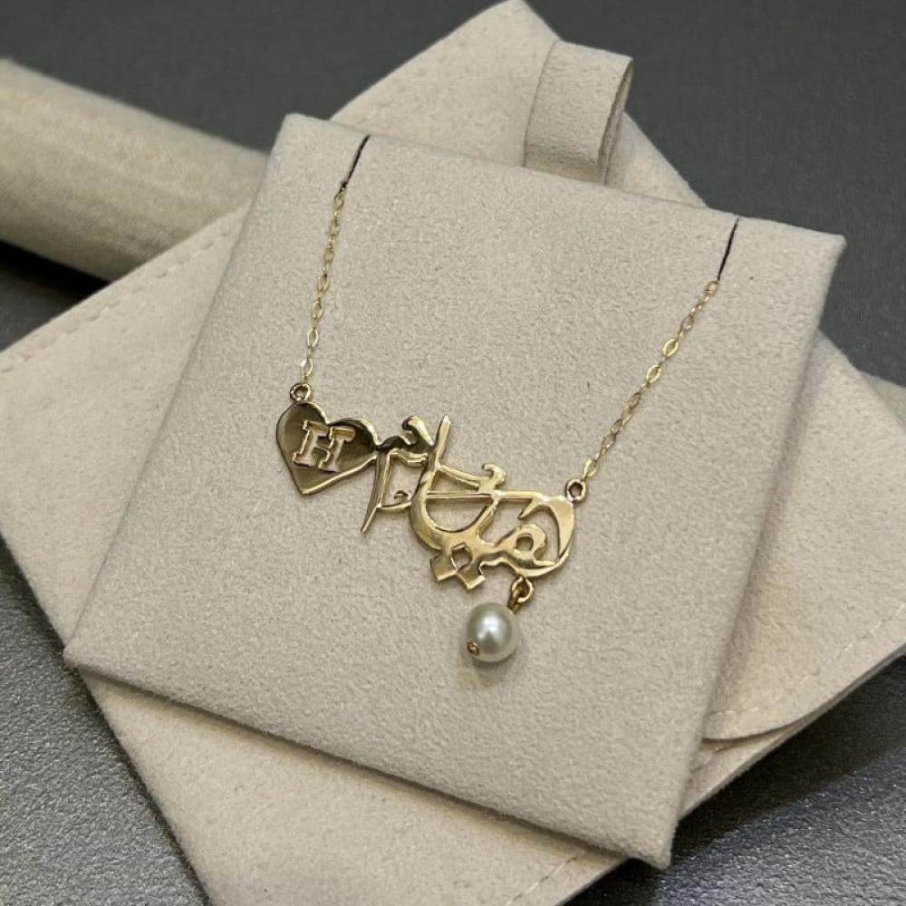 تألقي مع عقد ذهب عيار 21 أو 18 بتصميم فريد يحمل اسم "هيام" بأسلوب عربي أنيق يعكس الأصالة والرقي. تأتي القلادة الذهب بالاسم مزينة بلؤلؤة ناعمة تتدلى بنعومة من نهاية الاسم، تضيف لمسة أنثوية ساحرة. ويكتمل التصميم بقلب ذهبي رقيق يحمل حرف "H" ليمنحك بعدًا شخصيًا يعبر عن الحب والارتباط.
