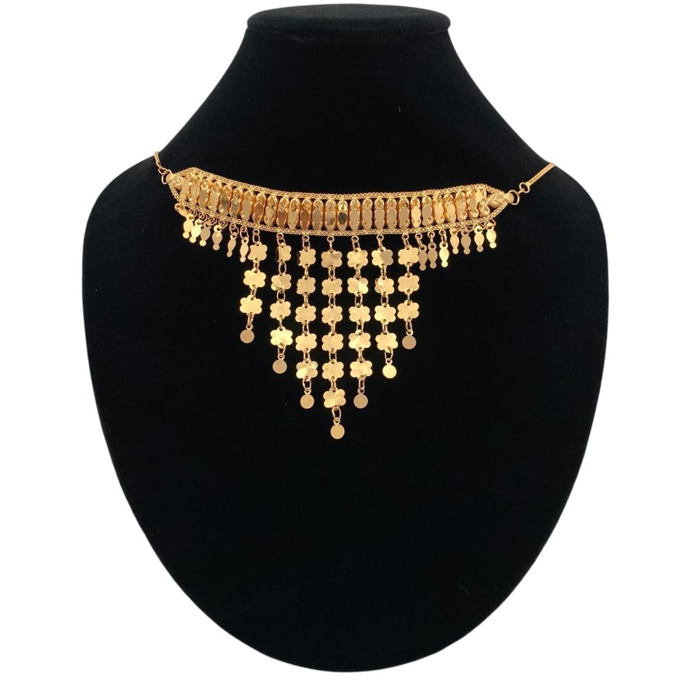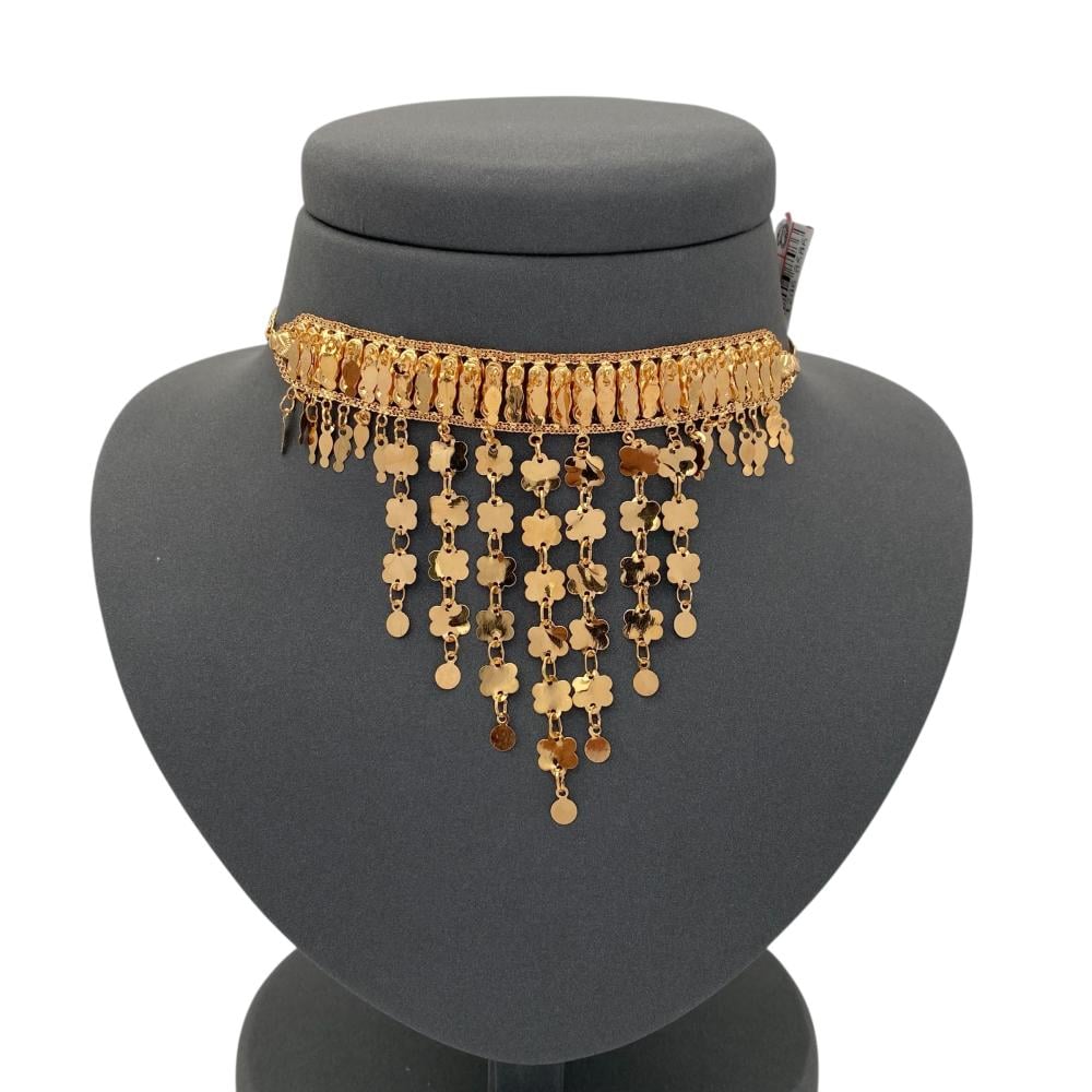 This choker features a sophisticated design that combines elegance and luxury. The dangling chains with gold motifs add a touch of sparkle and beauty to your neck. Whether you're attending a special occasion or a grand celebration, this choker will make you shine with an unforgettable look.