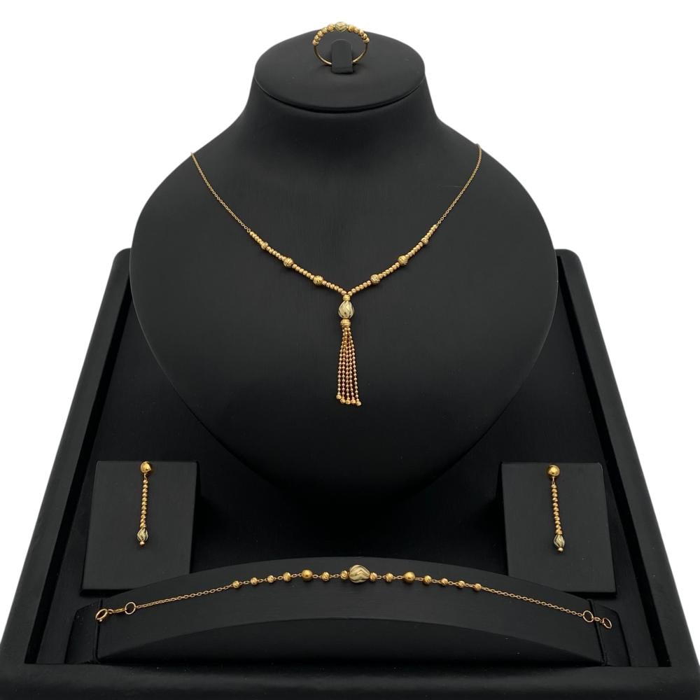 Gold has always been one of the finest metals, exuding elegance and luxury. This 21-karat gold set, weighing 10.89 grams, is an ideal choice that combines beauty and comfort. This set is more than just a piece of jewelry; it expresses your refined taste and attention to detail. If you're looking to add a touch of luxury to your look, this set is the perfect choice for you.