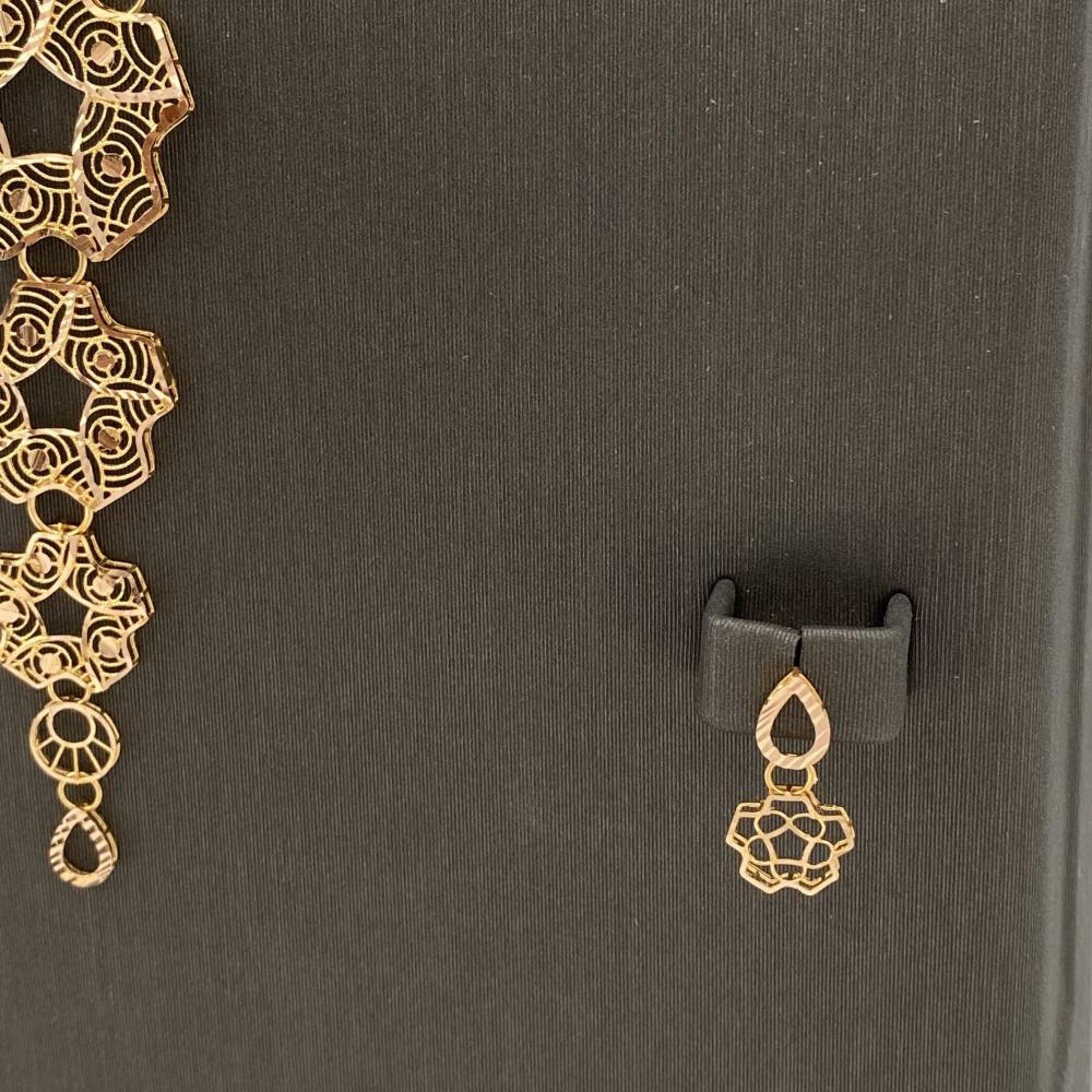 Choose this wonderful set that consists of 21 karat gold weighing 12.29 grams, containing distinctive pieces with a fantastic design and beautiful details. This luxurious set will reflect a look that suits you, my lady, and will give you unparalleled elegance. Get this elegant set and shine with a shiny and distinctive style.