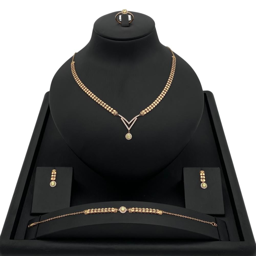 This 21 karat gold set is a true masterpiece weighing 14.37 grams, featuring distinctive pieces with a wonderful design and beautiful details that reflect your elegance and high taste. This shiny set will give you a look that suits you as an elegant and modern lady. Get these elegant pieces and shine with unparalleled and irresistible elegance.