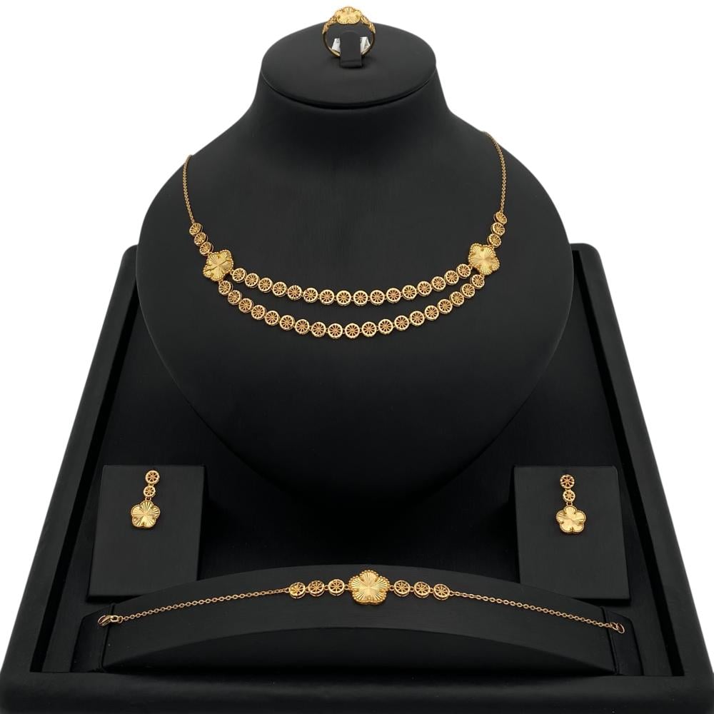 Add a touch of luxury to your look with this wonderful 21 karat gold set. The set weighs 17.45 grams and contains luxurious pieces with a fantastic design and beautiful details that make it suit you incredibly. These elegant pieces will make you shine with unparalleled elegance and express your refined taste. Get this beautiful set now and get ready for a charming and distinctive look that attracts attention!