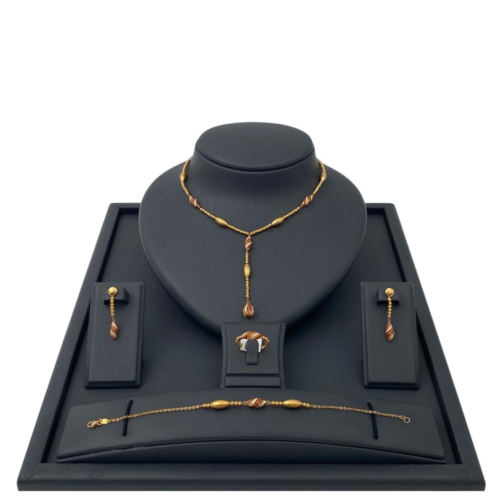 Get this wonderful and distinctive 21 karat gold set to shine on every occasion. The set weighs 18.84 grams and features a fantastic design and beautiful details that make you stand out and look elegant like no other. Get this elegant set and give your look a charming touch that will attract attention on every occasion you attend.