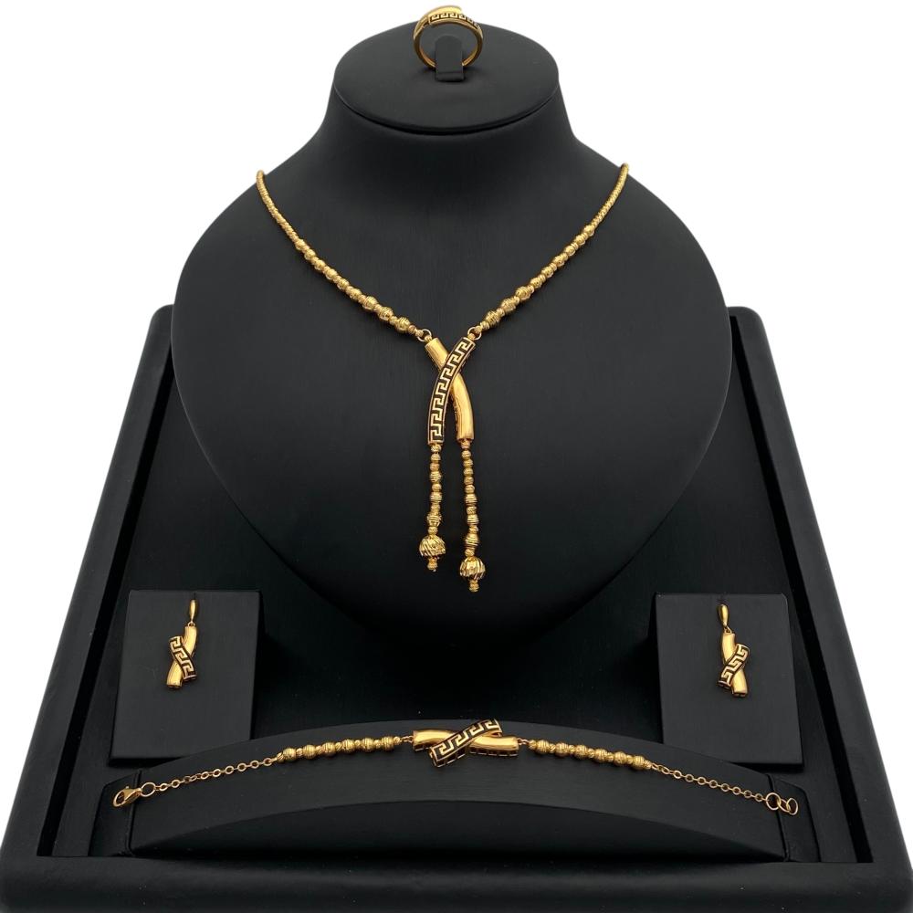 Gold is a symbol of elegance and beauty, and when combined with elaborate designs and fine details, it becomes an indispensable piece of jewelry for every woman looking for distinction. The 21-karat gold set weighing 26.69 grams is the perfect choice for the modern woman who seeks to appear elegant on every occasion. This set combines simplicity and luxury, adding a touch of sparkle to your look every time you wear it.