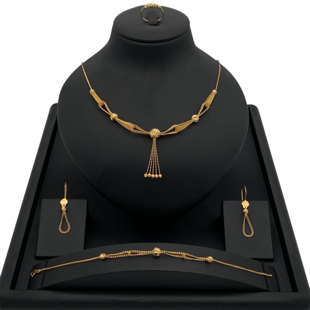 This distinctive set is made of luxurious 21-karat gold and consists of pieces that reflect your refined taste and add a touch of elegance to your look. This set weighs 5.68 grams, making it ideal for those looking for elegant details that highlight their beauty. Get this elegant set today and add a touch of charm and beauty to your look.