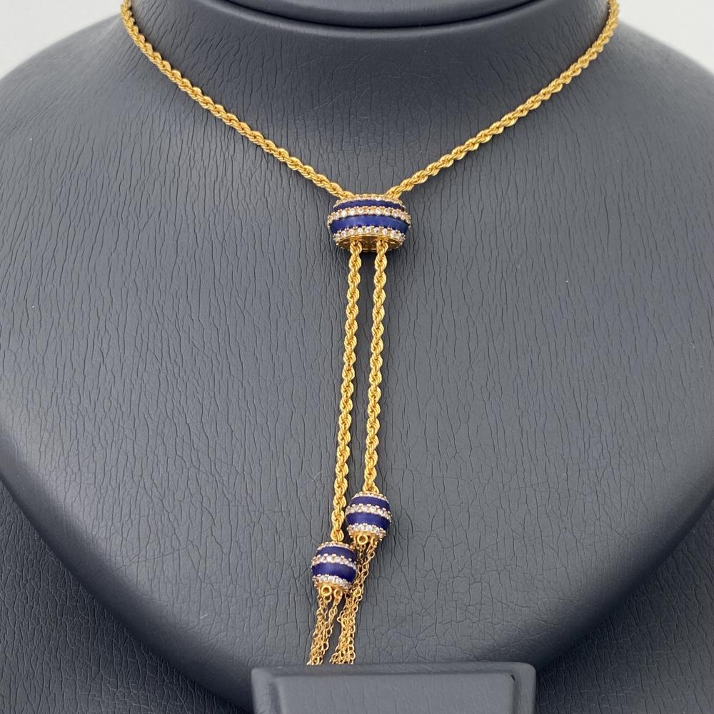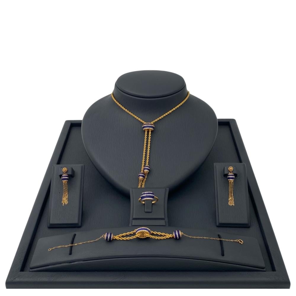 Qimat Zawiya Al Shifa Gold and Jewelry offers you a luxurious 21-karat gold set with a sophisticated design that exudes elegance and distinction. The set features dazzling blue decorative rings that add a touch of luxury to your look, along with a long necklace with gold chains that flow with attractive fluidity. The set is completed with a matching bracelet and ring featuring the same modern details, along with elegant earrings that add a touch of luxury. The design combines sophistication and modernity, giving you an exceptional presence on all occasions.