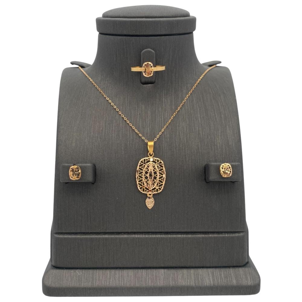 Shine with this stunning 21k gold half set, weighing 3.41 grams. Get these unique pieces of fine jewelry and add a touch of elegance and beauty to your look. These pieces feature an attractive golden shine and a sophisticated design that you can wear on special occasions and daily. Make them part of your collection to complete your elegant and distinctive look.
