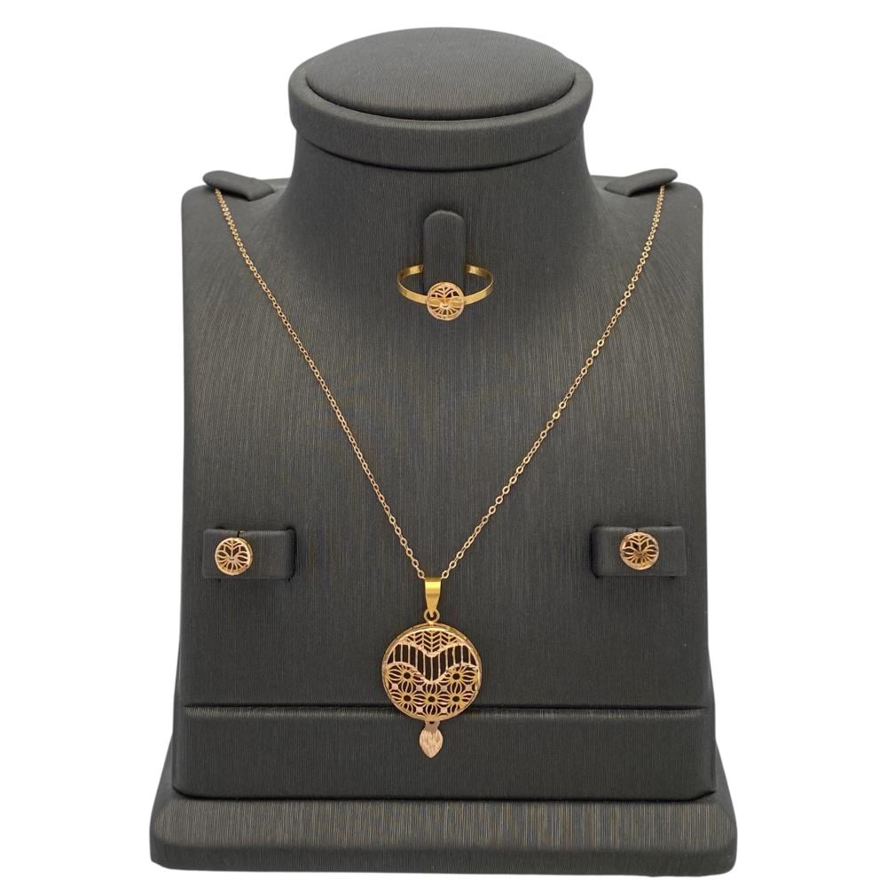 This 21-karat gold half-set, weighing 3.45 grams, includes luxurious pieces that add unparalleled beauty and appeal. It blends elegance and sophistication, creating a look that exudes taste and luxury. Get this elegant set and add a touch of luxurious elegance to your look. This set will be the perfect choice to complete your look with elegance and sophistication.