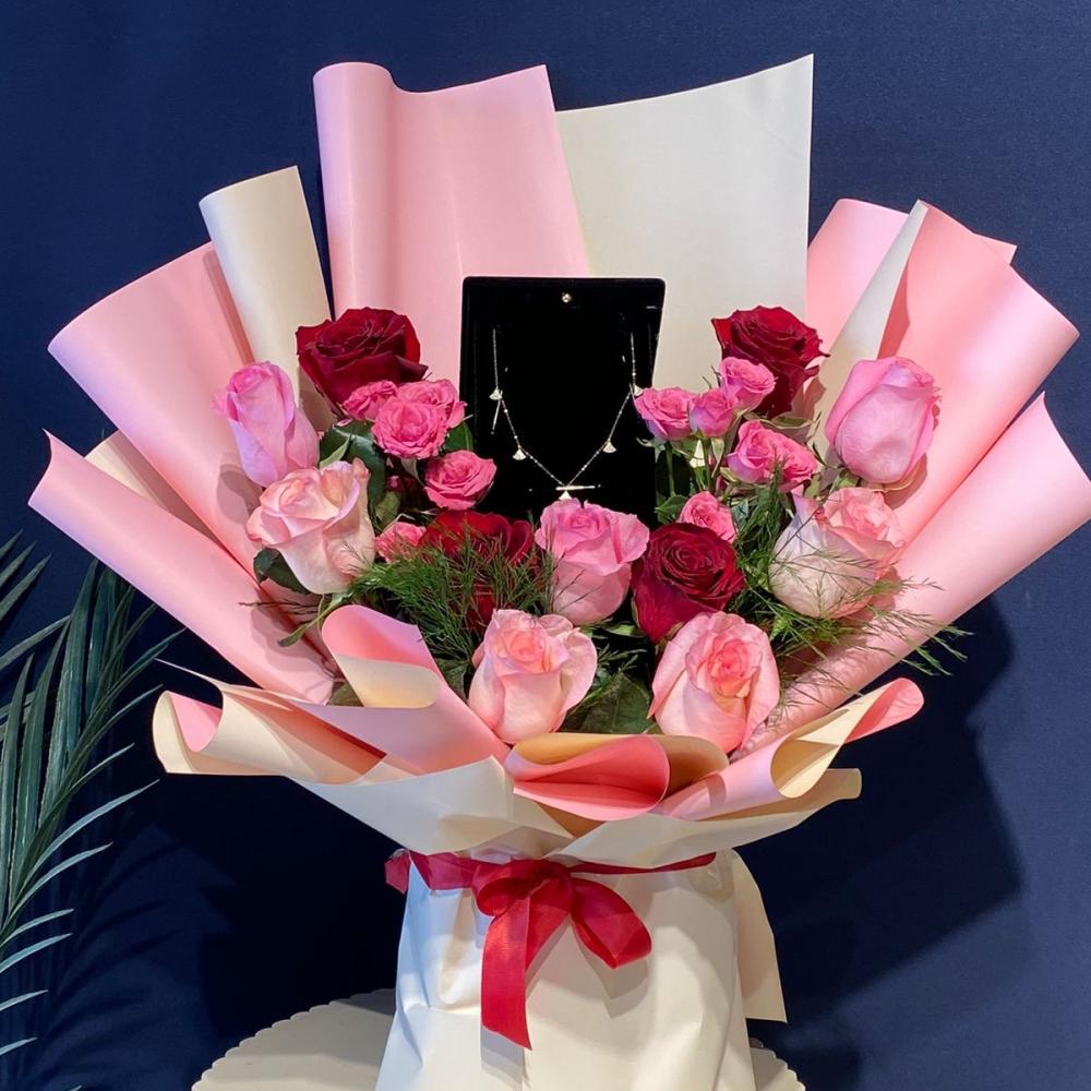 When you want to give a special person a piece of gold, a bouquet of natural roses gives the gift an irresistible romantic and aesthetic touch. Natural flowers express beautiful feelings and enhance the value of the gold gift, becoming a symbol of love and care.